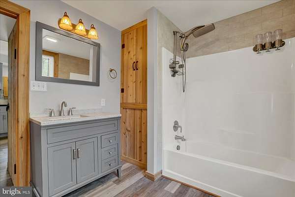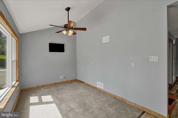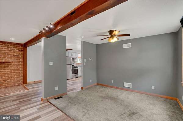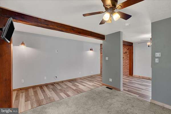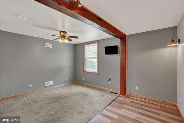 - Carpet, Ceiling Fan(s), Country Kitchen, Dining Area, Exposed Beams, Family Room Off Kitchen, Open Floor Plan, Tub Shower Bathroom