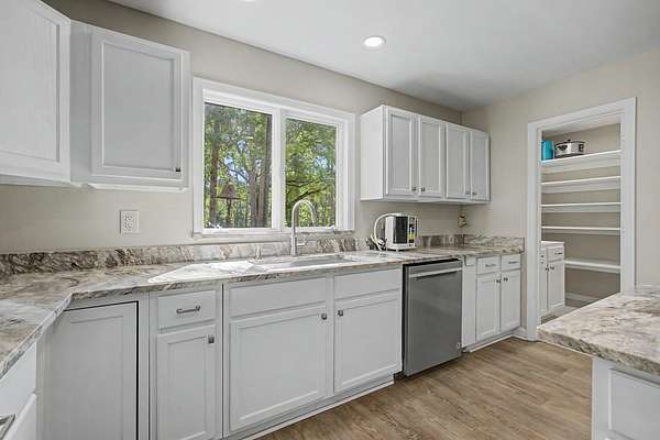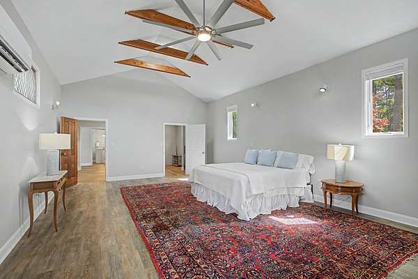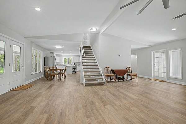 - High Ceilings, Pantry, Primary Downstairs, Split Bedrooms, Stall Shower, Sun Room, Tray Ceilings, Vaulted Ceilings, Walk In Closets, Window Treatments