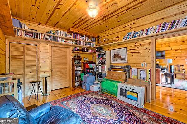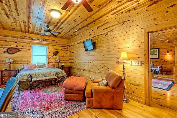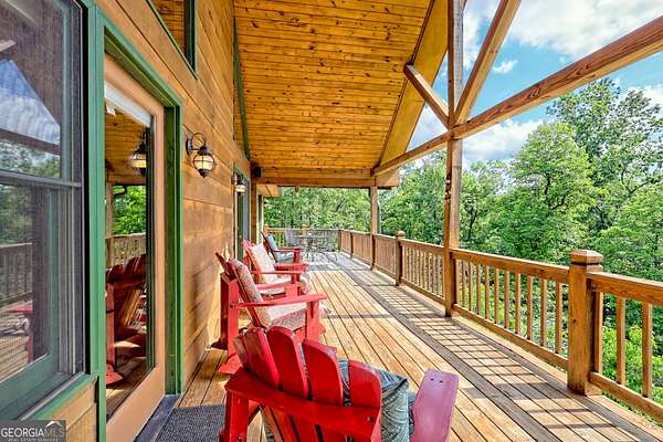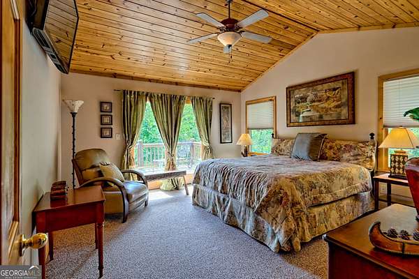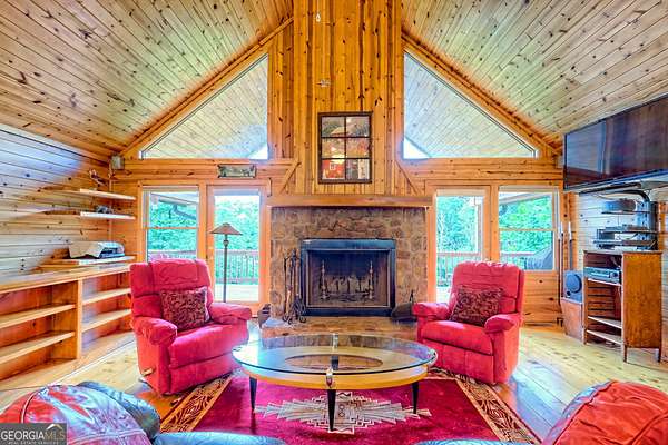 This luxurious mountain home offers a superb location as your base for your mountain adventures. Located within minutes of downtown Clayton, as you step inside, the expansive great room captivates with its striking stone fireplace and soaring vaulted ceilings, immediately immersing you in the charm of mountain living. The warm, wide-plank pine floors and walls lined with bookcases provide a perfect canvas for your favorite rugs and cherished mountain artwork. This remarkable home features two primary bedrooms on the main floor, each boasting a spacious private bath, walk-in closets, and French doors that gracefully open to expansive deck areas, perfect for outdoor gatherings. The kitchen offers a user-friendly layout, generous countertops, and ample storage. The lower level is every bit as impressive, offering its own entrance and driveway, making it a self-contained haven. It includes an additional bedroom, an adjacent full bath, a welcoming great room with a full kitchen, and a versatile flex room ideal for hobbies, a home office, or guests. Offered fully furnished, this expansive 2,900+ square foot home opens the door to countless possibilities-perfect for two families or for you to live on one level while renting out the other. With a new AC system and an almost new roof, you are assured of easy maintenance. This is more than a home; it's an opportunity for a lifestyle filled with adventure and connection!