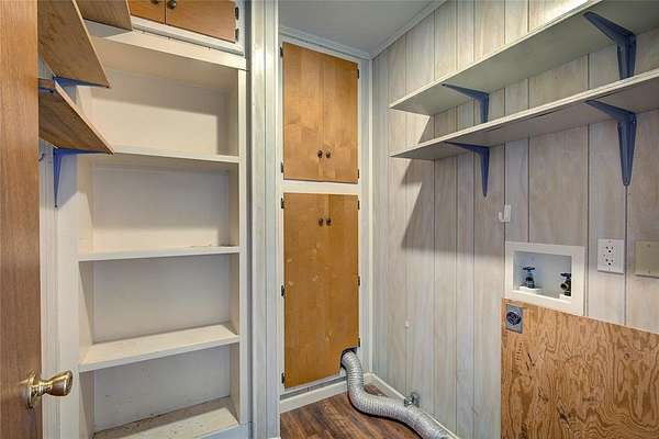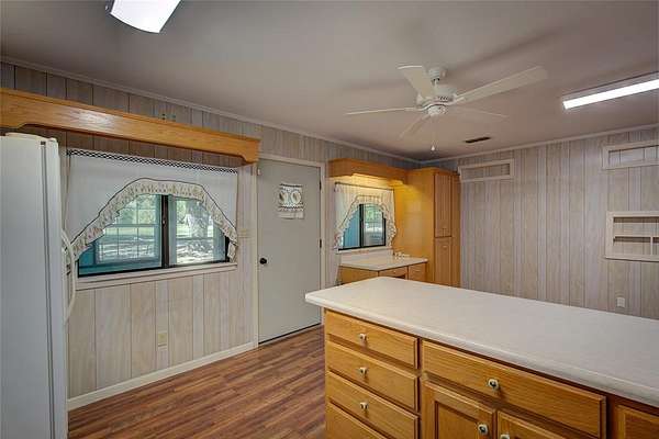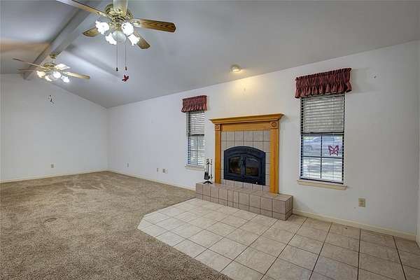 Inside, the spacious kitchen features an electric range, double sink, breakfast bar, and easy access to a large dining area complete with pantry cabinet and built-in homework desk. Adjacent utility room includes pantry shelving and a second water heater, ensuring hot water for the whole household. The vaulted living room boasts double ceiling fans and a cozy, tiled wood-burning fireplace--ideal for relaxing evenings.