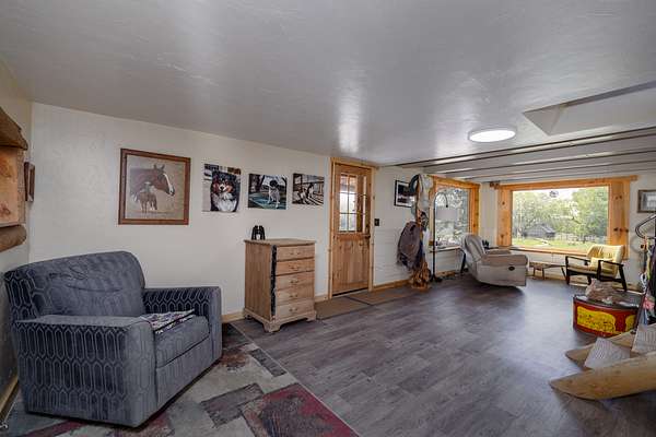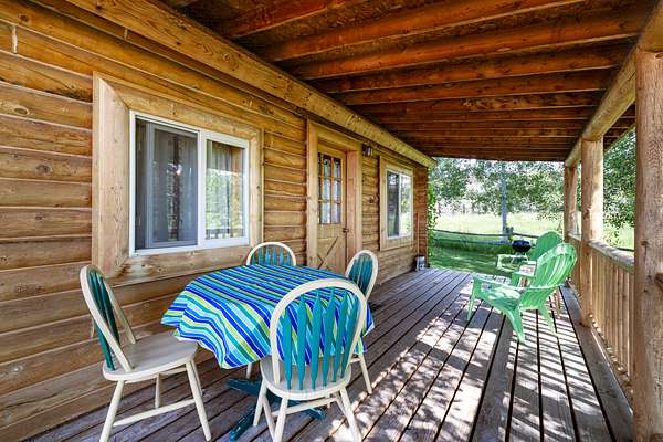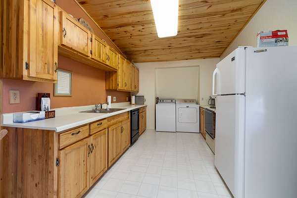 Last but not least is the Main Home on the ranch. It is frame built with Log siding. There is a nice authentic western/rustic feel to the house inside and out. Two large picture windows in the living room display a wide assortment of the wildlife in the area, as they meander around the ranch. The downstairs is a nice open living and dining area. The shiplap walls, with painted ceiling beams and laminate wood flooring were recently remodeled. The Kitchen is rustic with log walls and ceiling. There is an electric range refrigerator and dishwasher. The Bathroom is also log, with large antique claw foot tub and shower.