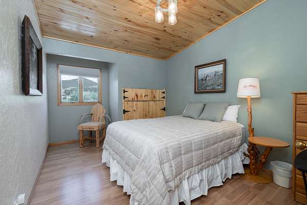 The upstairs is one large bedroom/sitting area with vaulted ceiling, Aspen wood and Log beams. The floor has recently been updated with laminate wood flooring. There is a large deck out the French doors with a great view of the mountains. Very secluded setting with no neighbors in sight!