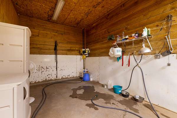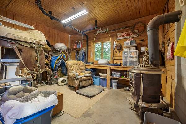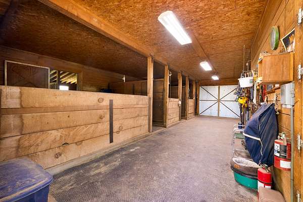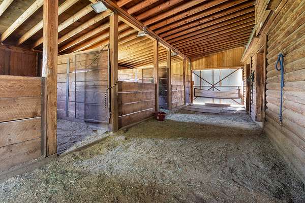 There is a six stall Log Horse Barn with tack room, feed room and shower stall with hot and cold water. The stalls and main aisle way are rubber matted. The 2nd aisle has a dirt floor that can be used as a small indoor turnout during inclement weather. The barn stays cool in summer and warm in winter.