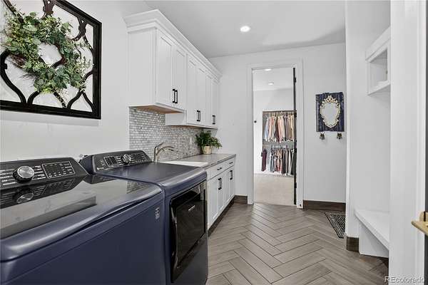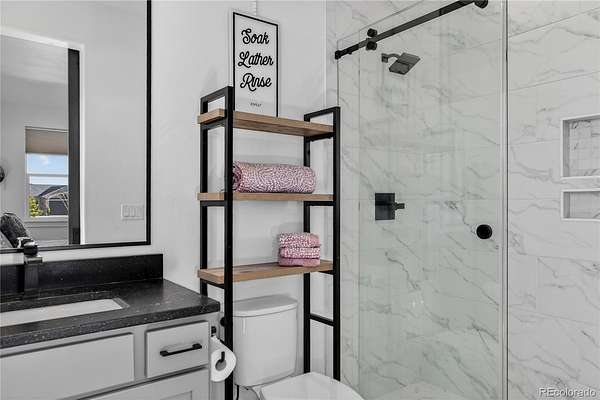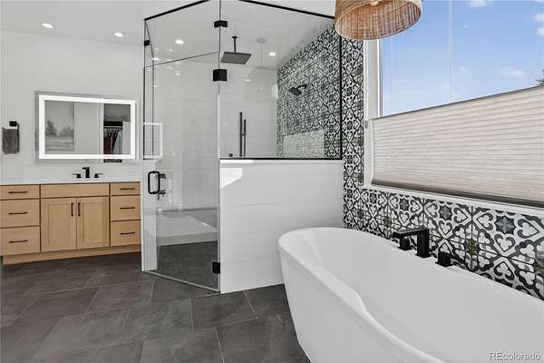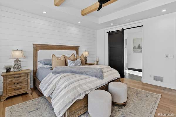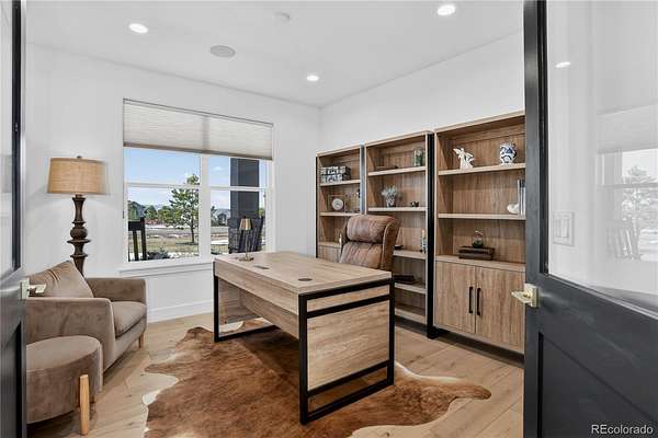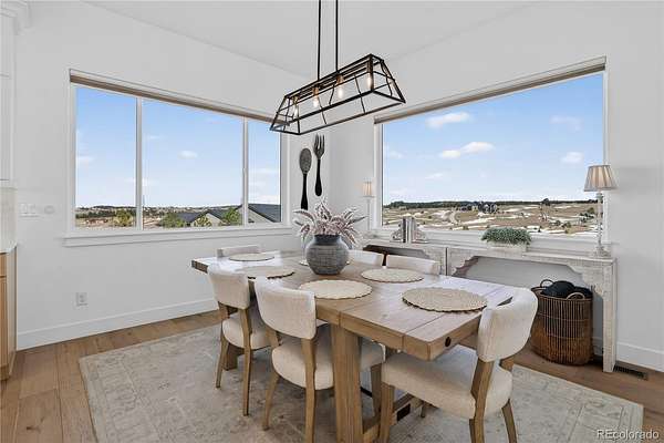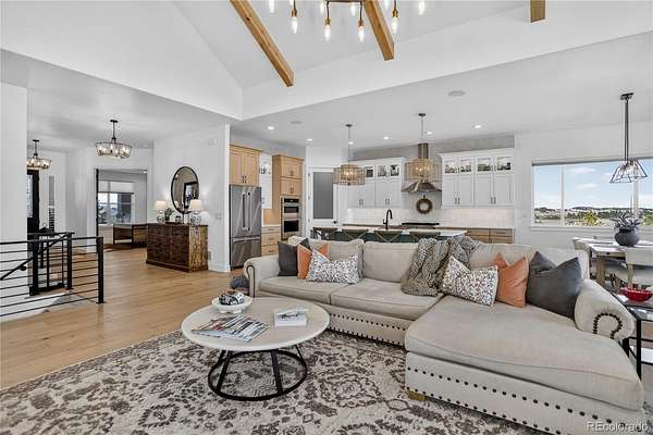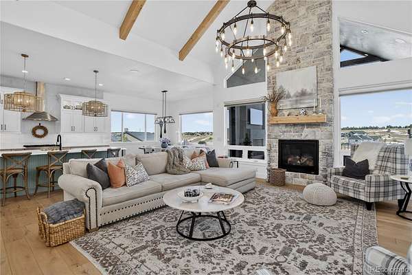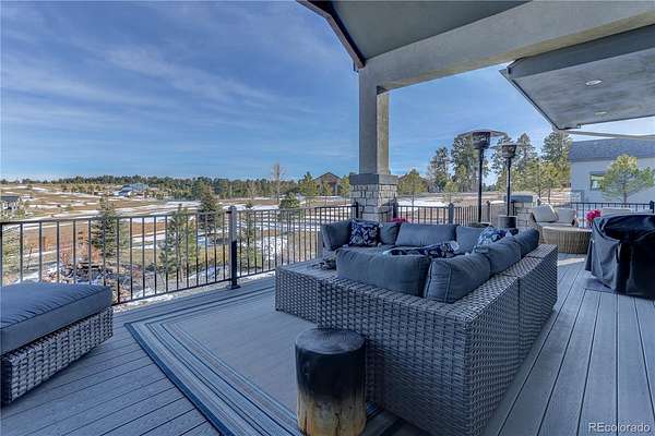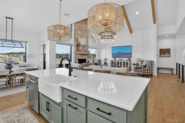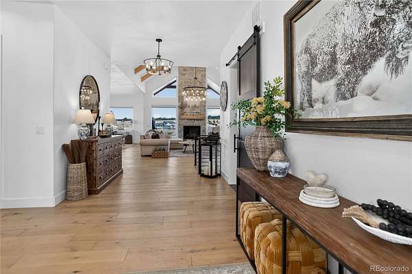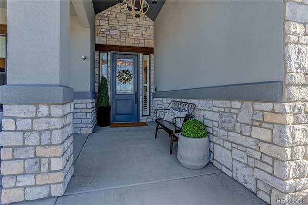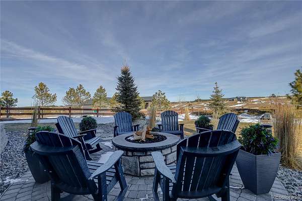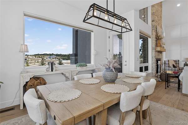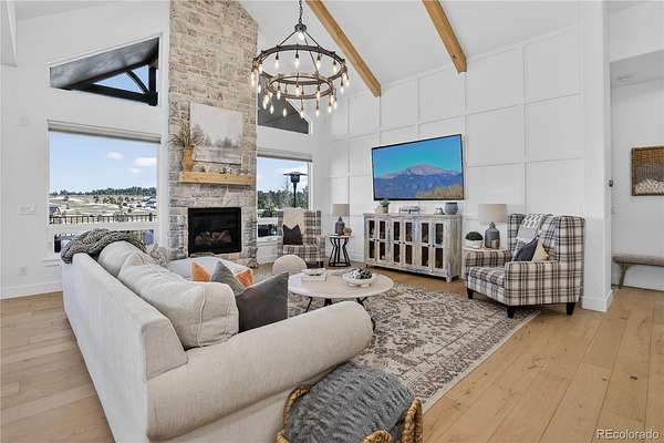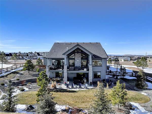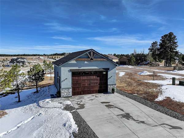 Escape the frenzied pace of city life in this fabulous 5BR/5BA custom ranch home located in Rollin Ridge Estates within the highly coveted Lewis-Palmer District 38. Completed in 2023, it offers exceptional design, superior quality, premium finishes and smart-home technology throughout. Set on a 2.5 acre tranquil cul-de-sac lot, it has both 4-car attached & 4-car detached heated, insulated, fully finished garages! Step through the welcoming covered front porch and foyer into the modern open floor plan and spacious light-filled great room with wide-plank hardwoods, soaring vaulted/beamed ceilings and a grand stone gas fireplace (1 of 4 in the home)! The gourmet eat-in kitchen features a massive entertaining island, quartz countertops, Jennair stainless steel appliances, farmhouse sink, spacious walk-in pantry and custom soft-close cabinetry. The luxurious main-floor owner’s retreat has a high coved/beamed ceiling, fireplace, and private deck access. The spa-inspired ensuite bath has radiant heated floors, double vanities, an enlarged glass shower, a soaking tub and an expansive walk-in closet with access to the utility/mud room. A second spacious guest bedroom with ensuite bath & walk-in closet, an office/guest bedroom, a ½ bath, mud room & well-appointed laundry complete the main level. Downstairs, the fully finished walkout basement boasts high ceilings, a large rec room with fireplace, wet bar, two additional bedrooms with ensuite baths & huge walk-in closets, and a third non-conforming bedroom or flex space. The large deck and lower-level patio have open & covered entertaining areas and include a fireplace, TV, 8-person hot tub, and gas fire pit all overlooking an extensively landscaped treed irrigated yard with beautiful stone water feature, split-rail fence, and invisible fencing for your pets. Experience the perfect blend of comfort and elegance in this exceptional home offering a rare balance of close-in country living with easy access to urban conveniences.