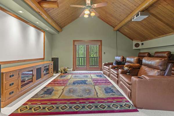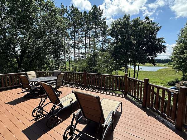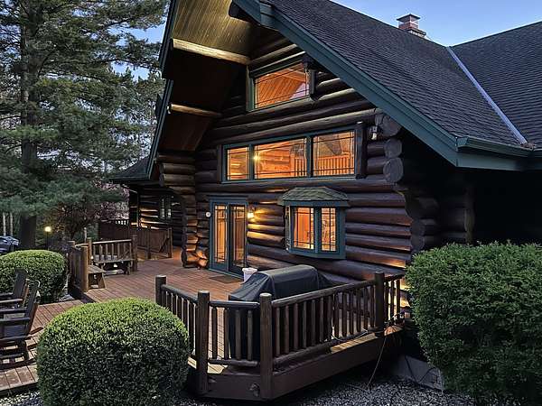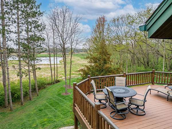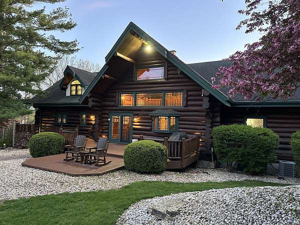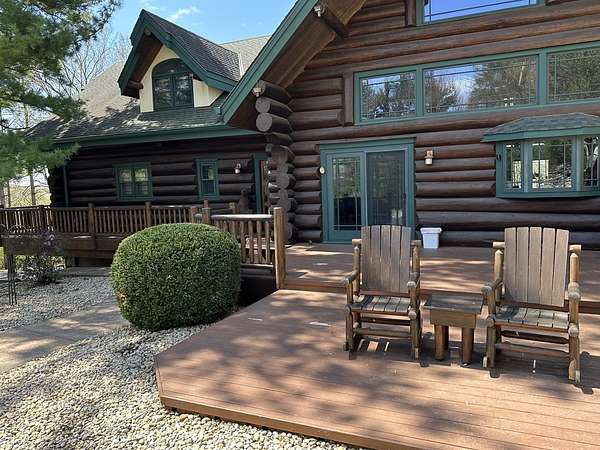 Handcrafted full log home secluded on 5 acres. The 2 story Great Room has floor to ceiling masonry fireplace and great open views. The high end kitchen has newer built-in appliances, granite counters, island with stools and a walk-in pantry. There are 2 bedroom suites, one on the main floor and one upstairs. The theater room includes equipment and recliners. The large loft space overlooks the Great Room. The finished walkout basement has a recroom with bar, indoor pool and full bath. Enjoy the gorgeous lake view from the expansive deck. Incredible landscaping includes a waterfall. There are 2 large outbuildings with electric and concrete floors. One of the buildings is heated. These are good for car collection, shop, storing your boat and toys. The home has a Woodstock address and is in the Crystal Lake school district. You will feel like you are in the Northwoods but it is 10 minutes to Metra trains, 1 hour to O'Hare and Chicago.