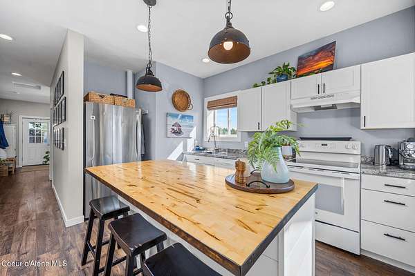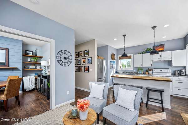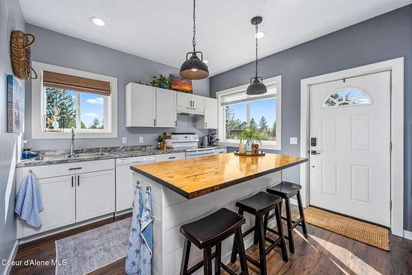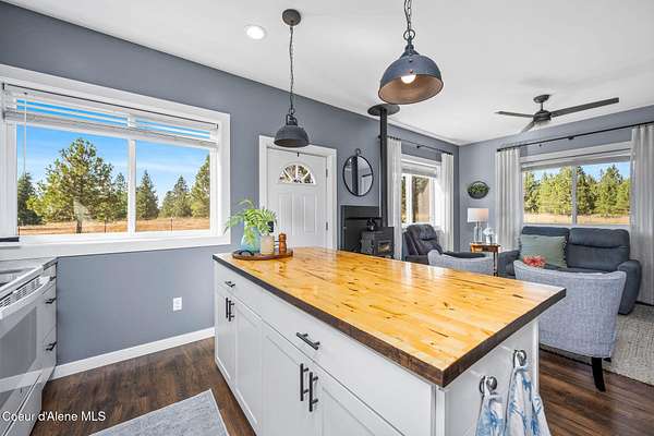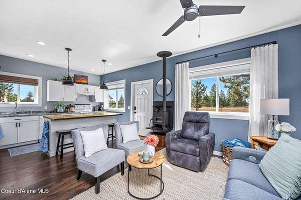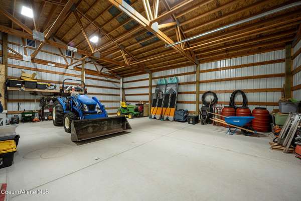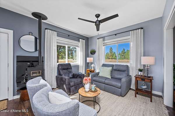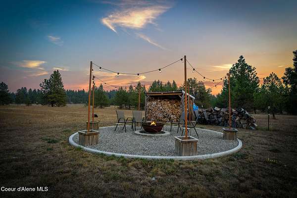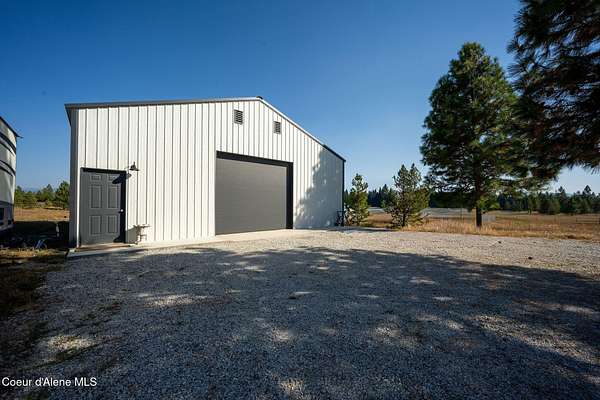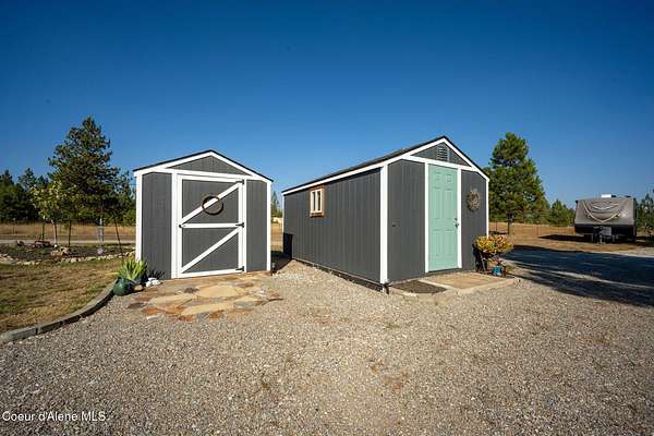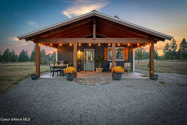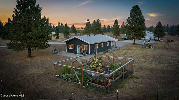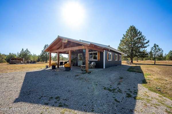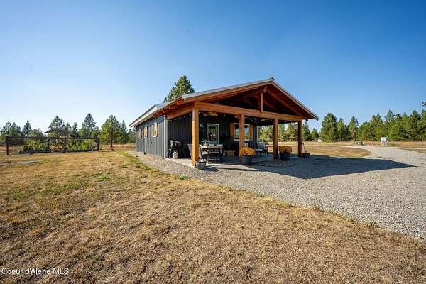 Experience a big life style in a peaceful North Idaho setting on over 5 serene acres! This charming 2-bedroom, 1-bath home offers a thoughtfully designed space with an open kitchen/living area with butcher block island and the 2nd bedroom used as great little dining/office area. A wood-burning stove to keep you warm, while the mudroom area and laundry room add everyday convenience. Step outside to a huge covered patio perfect for relaxing or entertaining. Enjoy amazing sunrises and sunsets from every angle of this property! A fully fenced garden area, fire pit with twinkling white lights, and a shed with power that is currently used as an extra TV room, but could be anything you want! The large 36x36 shop has a front roll-up door and a back slide door, ideal for projects, storage, or toys. A chicken coop rounds out the homestead feel. Quiet, private, and packed with charm, this property is your perfect escape into nature while being just a few minutes from town. Furniture negotiable