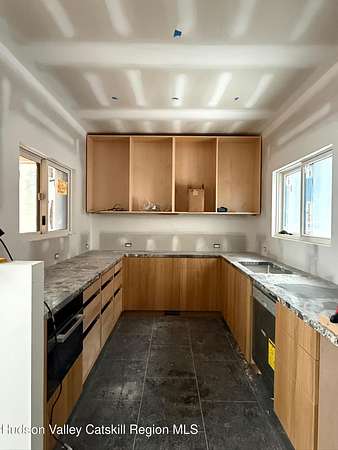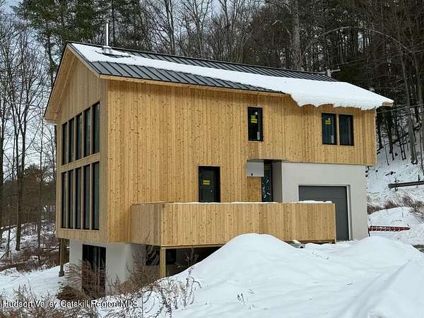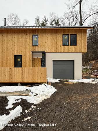 Set on a serene two-acre parcel that spans both sides of a quiet country road, this exceptional new residence, scheduled for completion in March 2026, offers a rare blend of modern architectural polish and timeless natural beauty. A gentle creek meanders through the landscape, creating a soothing backdrop to a home with warm materials, refined craftsmanship, and high-performance building standards. The primary residence encompasses 2,040 square feet of conditioned space, with two bedrooms both featuring an ensuite bath. The interior palette is understated yet luxurious: Belgian bluestone and wide-plank Mirage engineered oak flooring set a grounded tone, while custom white oak cabinetry and integrated Miele appliances lend a seamless elegance to the kitchen. Ceppo Di Gre stone slab countertops add richness and texture, complementing the home's natural material ethos. Every detail speaks to quality and intentionality. The exterior is clad in cedar siding and stucco rain-screen over a Zip System sheathing, topped by a standing seam metal roof. The home is constructed to meet high-performance standards with an R35.5 wall assembly and an R60 roof, ensuring exceptional thermal comfort year-round. A whisper-quiet ground-source heat pump from Dandelion provides heating and cooling to the central forced air system. An original 1956 Montgomery Ward structure has been carefully reimagined as a conditioned accessory structure with a half bath. It offers 420 square feet of flexible space - ideal for a studio, guest quarters, or remote work. The home includes an oversized one-car garage with 390 square feet of additional space. Outdoor living is enhanced by a 125-square-foot screened-in cedar patio overlooking a creek, which invites quiet mornings and evenings immersed in the surrounding natural beauty. Premium fixtures and finishes throughout the home: Kohler plumbing, Toto toilets, an Electrolux washer/dryer, and a Zephyr exhaust hood round out a best-in-class appliance suite. At the heart of the double-height living space, a Stuv wood-burning stove adds warmth and sculptural elegance. While it feels worlds away, the property is ideally situated for connection to the region. High Falls is just three minutes away, with the charming hamlets of Stone Ridge and Rosendale reachable in under eight. New Paltz lies 12 minutes to the south, Kingston is a 20-minute drive, and Minnewaska State Park Preserve, with its celebrated trails and vistas, is just 15 minutes away. With construction well underway and completion anticipated in December 2025, there is still an opportunity to personalize select finishes. This is more than a home - it is a cohesive retreat where sustainability meets sophistication in the heart of the Hudson Valley.