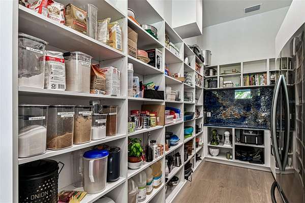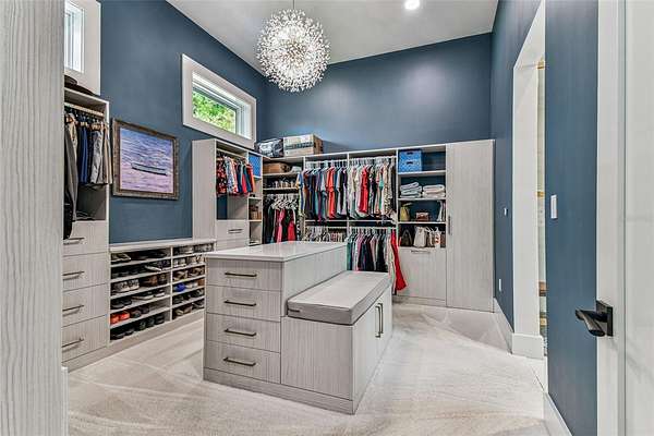 - Crown Molding, Eat-In Kitchen, High Ceilings, In Wall Pest System, Kitchen/Family Room Combo, Open Floorplan, Primary Bedroom Main Floor, Solid Surface Counters, Thermostat, Walk-In Closet(s)
