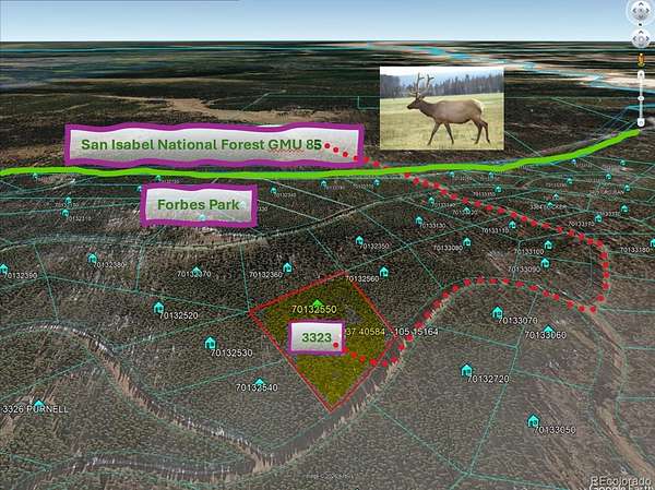 Find yourself (or lose yourself) in this in this densely forested property in the gated community of Forbes Park. Untouched by the 2018 Spring Fire, this sprawling parcel offers 4.14 acres of lodgepole and ponderosa pine, fir, spruce, and aspen trees. Conveniently situated on a gentle upslope side of the road, the terrain features level areas and sloped areas along with natural clearings, perfect for secluded camping or an off-grid cabin. Only ½ mile from the private entrance to the San Isabel National Forest, this is a hunter’s paradise, or a quiet, cool retreat in the fresh mountain air, far from the city noise and heat. Forbes Park provides a small Community Center with 24/7 free WiFi, showers, and frequent potlucks where you can meet other friendly residents. All 4 property corners are marked. Dues are only $350/yr and cover road maintenance, trash dumpster, package shed for deliveries, 50-gal water/day for RV, a gated entrance, and regular communications. GPS: 37.40584, -105.15164. Gated entrance; prior arrangements for a showing are required. Listing agent is a local resident.