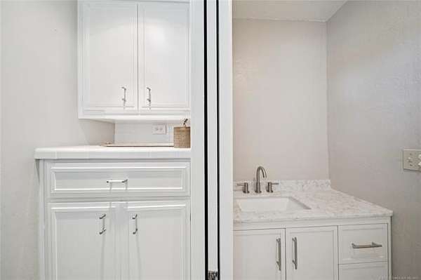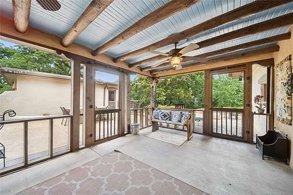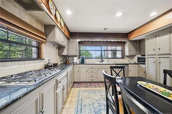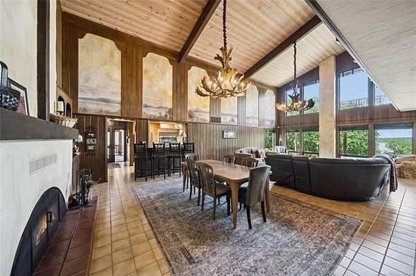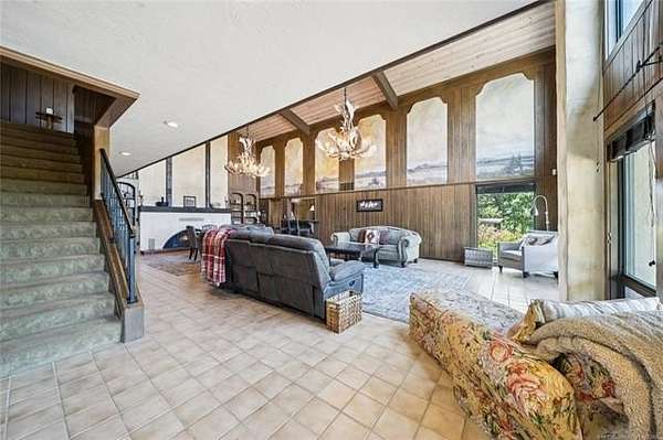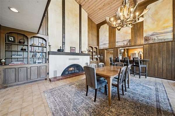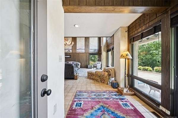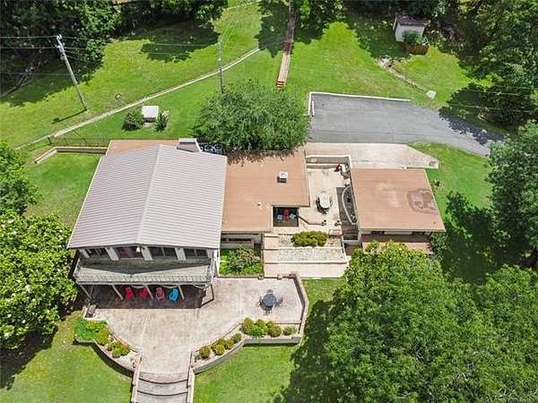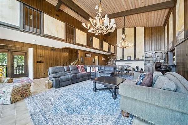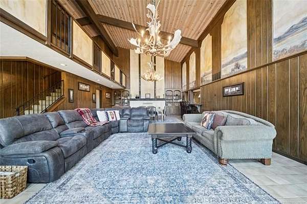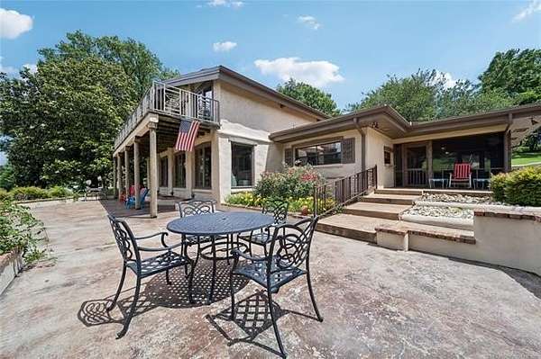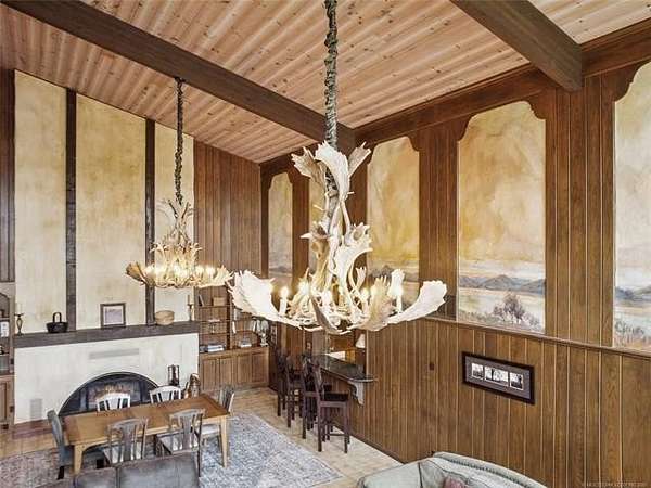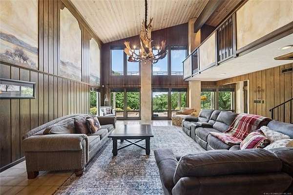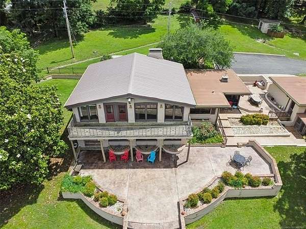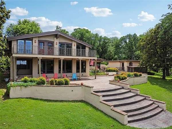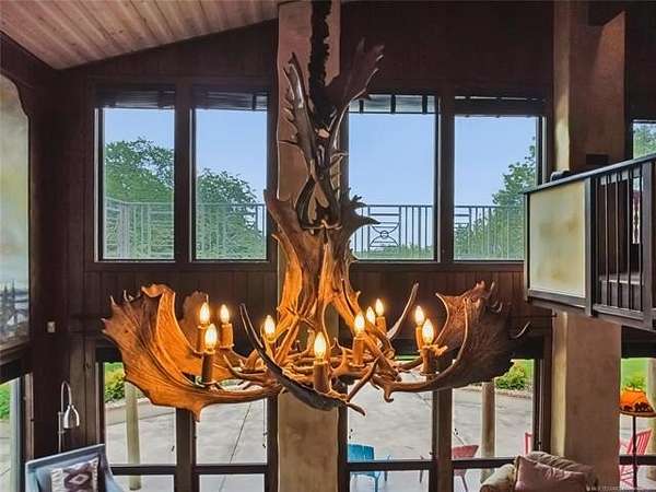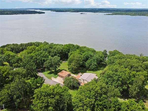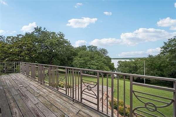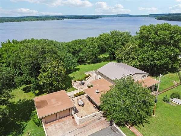 Nestled on over 2 acres of serene, wooded land along the shores of Fort Gibson Lake, this home known as: The Villa at Sportsman Club, offers a rare opportunity to own a piece of Oklahoma's natural beauty. Once part of a historic ranch, this property has been transformed into a private haven, perfect for those seeking tranquility, wildlife observation, and a close-knit community. Enjoy direct access to the lake with a dock featuring a boat slip and hydro-lift. The expansive patio spaces including an enclosed patio plus a balcony provide stunning views of the water, making it an entertainer's dream or a peaceful retreat. This 3-bedroom, 2-bathroom home has been thoughtfully updated to blend modern comforts with rustic charm. Recent renovations include new paint, carpeting, and renovated bedrooms. The vaulted living room boasts a 20+ foot ceiling with exposed beams, a massive wood-burning fireplace flanked by built-in cabinetry, and unique antler chandeliers. Upstairs, a large bedroom and full bathroom offer privacy and comfort. The kitchen features stainless steel appliances--including a gas stove, double ovens, microwave, and dishwasher. A large window overlooks the backyard and lake, bringing in natural light and scenic views. Bar seating connects the kitchen to the living area, creating an open and inviting space. Two-car garage with ample storage space with stairs down to a Basement (plumbed for a toilet and shower, offering potential for a future workout space or guest suite). Enclosed patio for year-round enjoyment, mature trees and abundant wildlife, including bald eagles. Whether you're seeking a weekend getaway or a full-time residence, The Villa at Sportsman Club provides a unique blend of natural beauty, modern amenities, and a welcoming community.