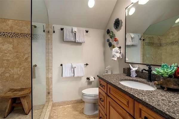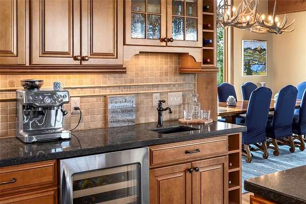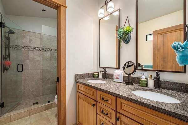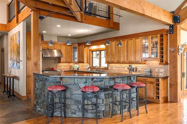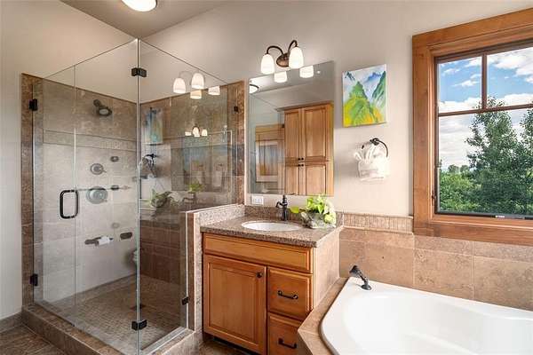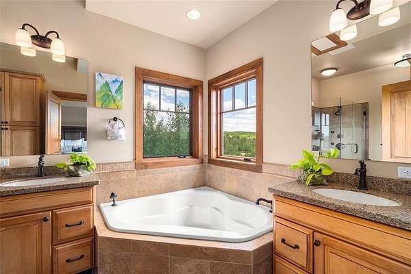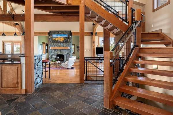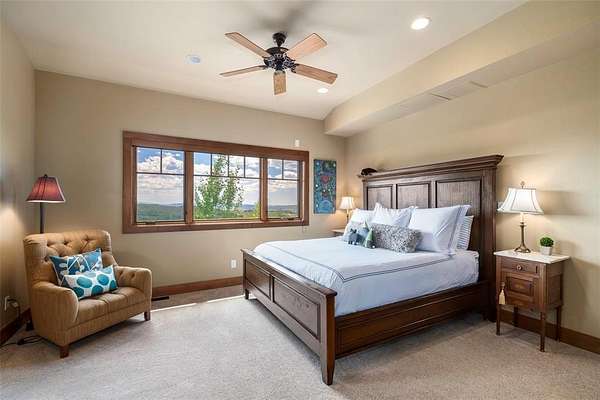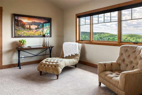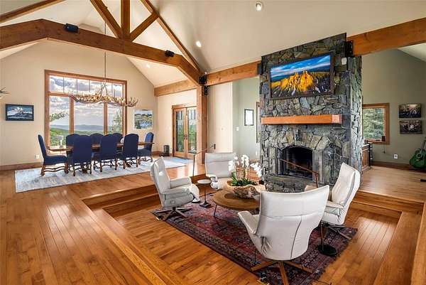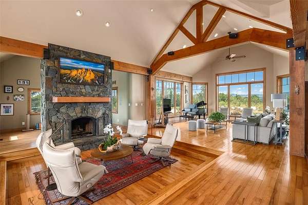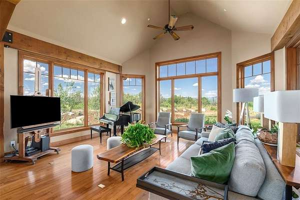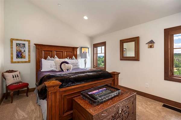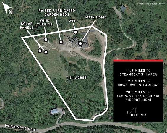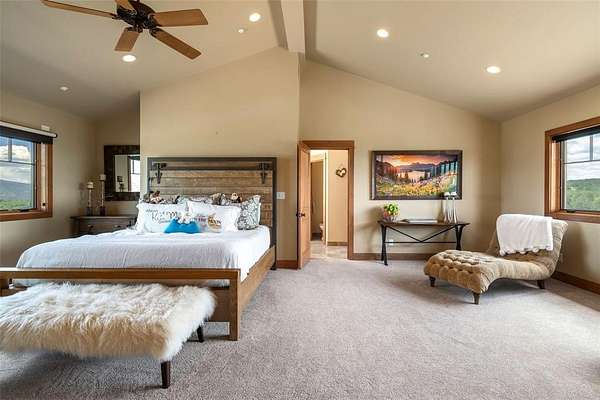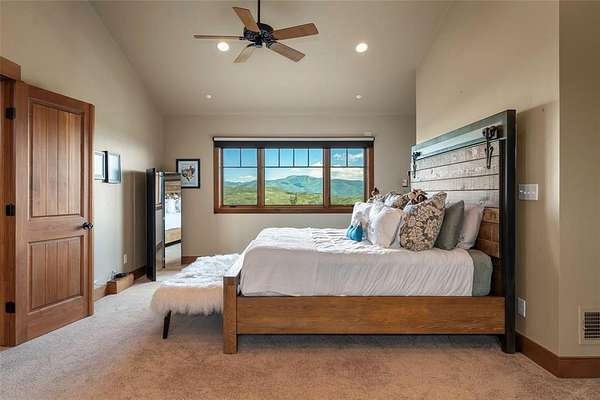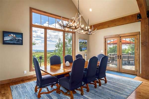 Perched above the South Valley in Whitewood, 33250 Ravenswood Lane is a privately sited hilltop estate spanning nearly 8 acres with sweeping 360-degree views from the Steamboat Ski Area to the Flat Tops, Hahns Peak, and the Zirkel Mountains. At 6,860 square feet, the residence pairs legacy-scale living with meticulous design and a level of engineering and infrastructure rarely found in residential construction. Soaring ceilings, hand-carved wood beams, and clerestory windows draw the landscape into the vaulted great room, anchored by a floor-to-ceiling Pennsylvania blue stone fireplace and adjoining sunken lounge. The main level includes a chef's kitchen, office, dedicated ski and gear rooms with custom boot, glove, and coat heaters, and the first of two primary suites, soundproofed for comfort. Upstairs, a private sitting room leads to the second primary suite featuring sunrise and sunset views, vaulted ceilings, and an oversized shower and soaking tub. On the opposite wing, a 3-bedroom, 2-bath guest suite with kitchenette and private entrance provides lock-off flexibility for extended stays. The lower level is designed for gathering, with a home theater, game room, a gym, and an in-ground hot tub for twelve. Four heated garage bays plus a workshop offer over 1,900 square feet for vehicles, equipment, or projects. Geoexchange heating and cooling, solar panels, and a wind turbine support efficient operation. Among the exceptional sustainably focused features are a deep well, whole-house filtration, humidification, commercial-grade air exchange, generator, and multi-zone climate control. Extensive irrigated landscaping, mature trees, picturesque fenced gardens, and dual decks oriented for both sunrise and sunset complete this extraordinary, self-sufficient South Valley offering.