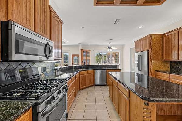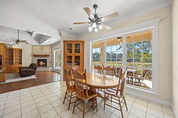 As you step through the front door, you're immediately greeted by a gracious foyer and an elegant formal dining room. The flow leads effortlessly into the spacious, open-concept living room and kitchen. The chef-inspired kitchen boasts cabinets galore, beautiful granite countertops, a stylish backsplash, an island, a breakfast bar, and a gas cooktop, all complemented by a convenient built-in desk area. The living room is the heart of the home, featuring a cozy gas fireplace, built-in shelving, and a breathtaking wall of windows offering panoramic views of the back pasture and one of the property's two tranquil ponds.