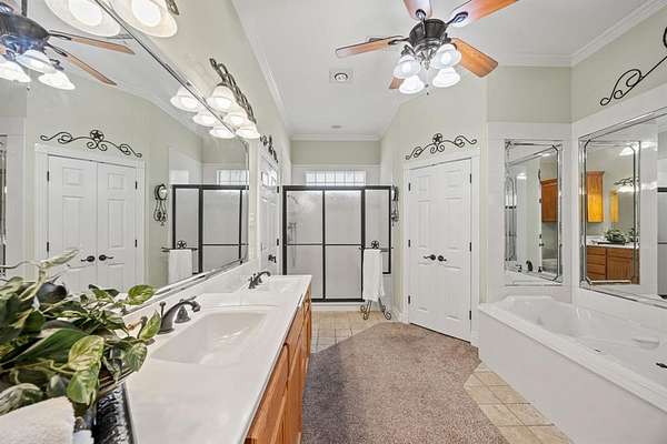 Designed for ultimate privacy, the spacious primary en-suite is thoughtfully separated from the secondary bedrooms. It features a luxurious soaking jacuzzi tub, dual sinks, and two separate closets. The secondary bedrooms are located on the opposite side of the home, with easy access to a shared full bath.