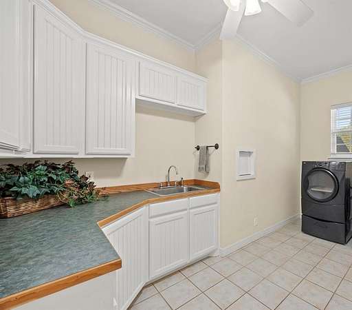 Oversized three car garage features a utility sink, and built to accommodate larger vehicles.