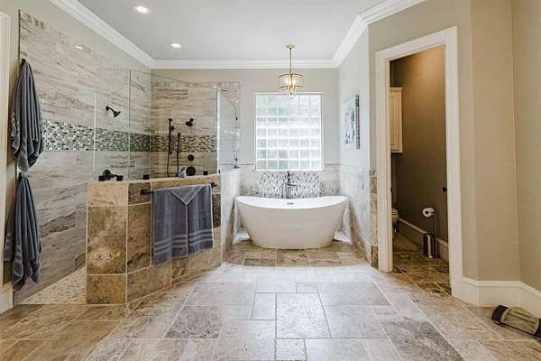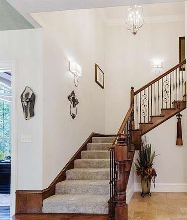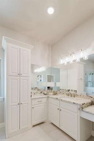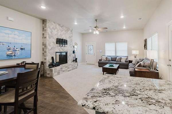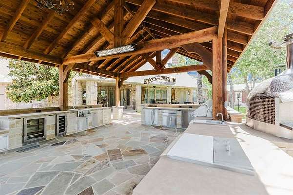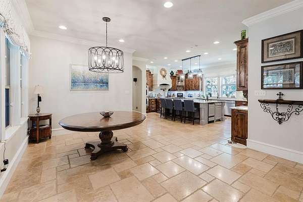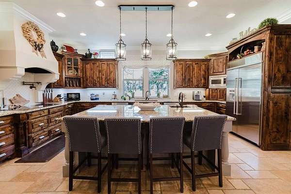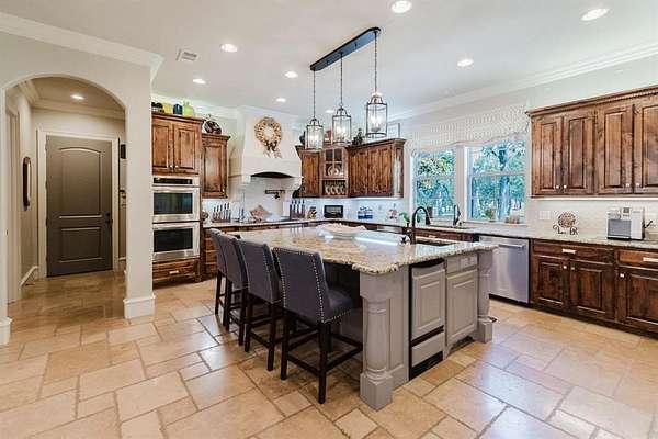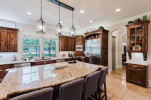 - Chandelier, Decorative Lighting, Dry Bar, Eat-In Kitchen, Granite Counters, Kitchen Island, Sound System Wiring