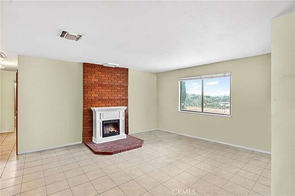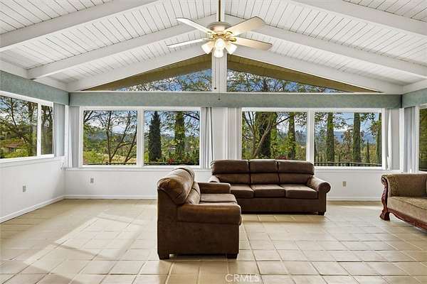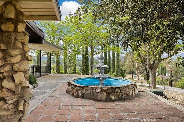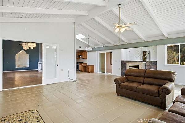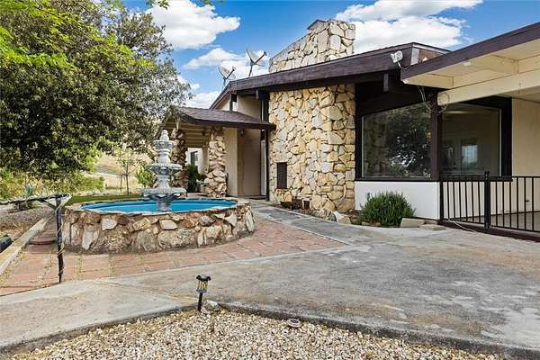 The main residence welcomes you with a circular drive, mature trees, and a charming fountain entry. Inside, the home offers a spacious layout with two separate living areas, ideal for both relaxed living and entertaining. A striking stone fireplace anchors the space, while large windows and vaulted ceilings frame the surrounding views.