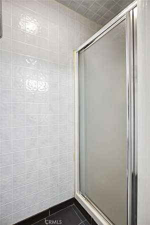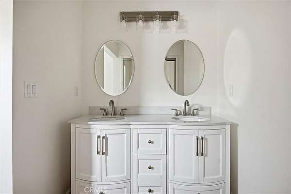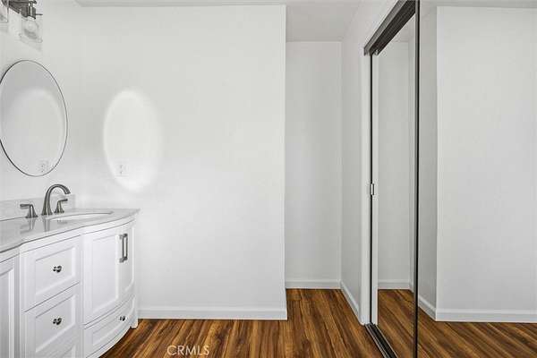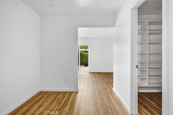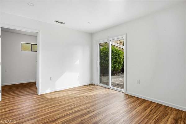 The primary suite includes a walk-in closet, dual vanities, and a walk-in tile shower, with a sliding glass door leading to a private patio. Interior finishes include laminate-style flooring in the primary, carpeted secondary bedrooms, and tile throughout the main living areas. A flexible office or bonus room provides potential for a third bedroom or dedicated workspace.