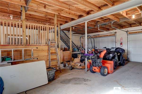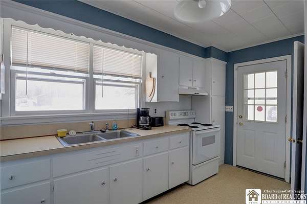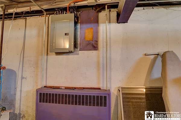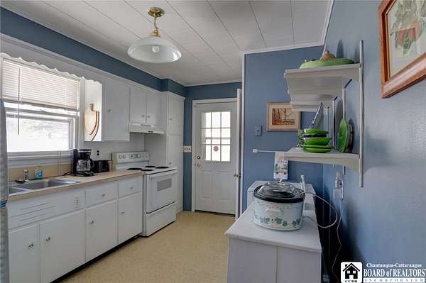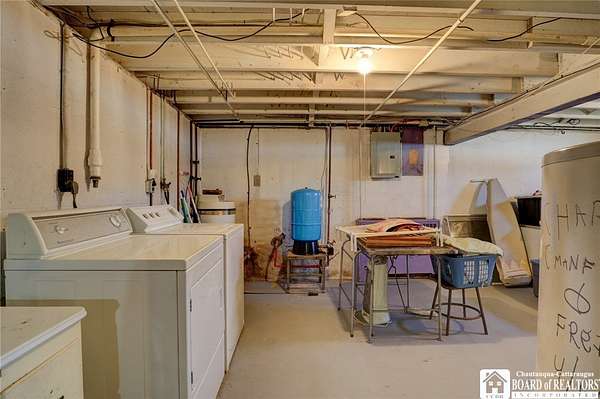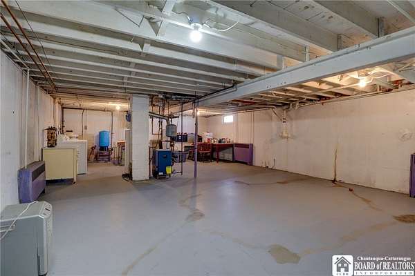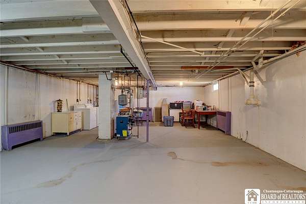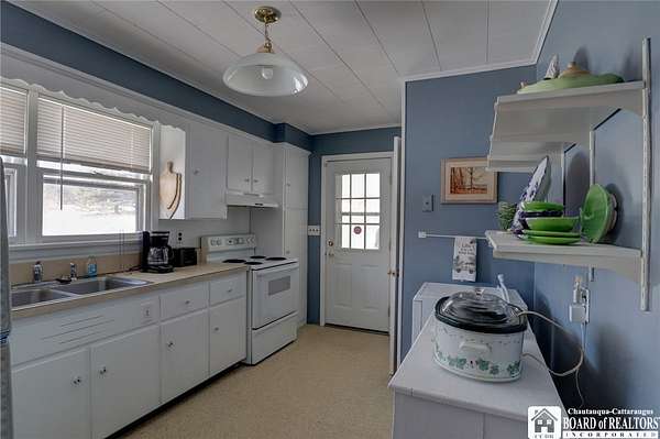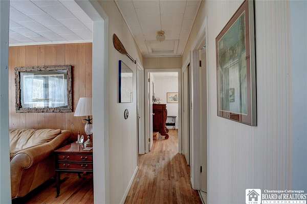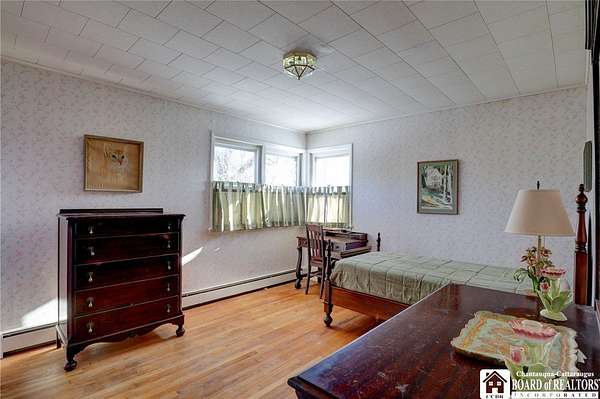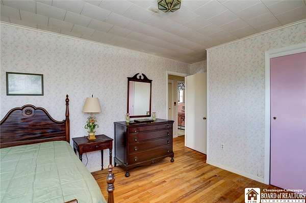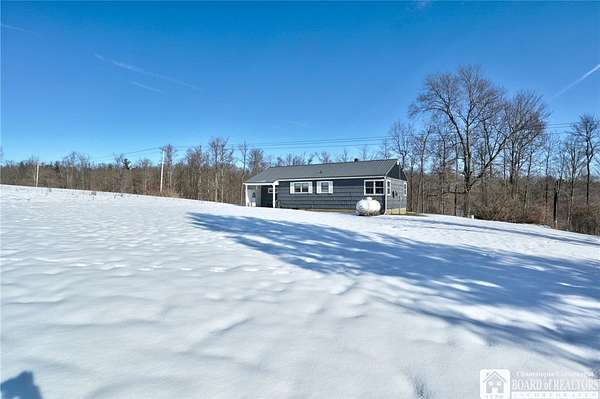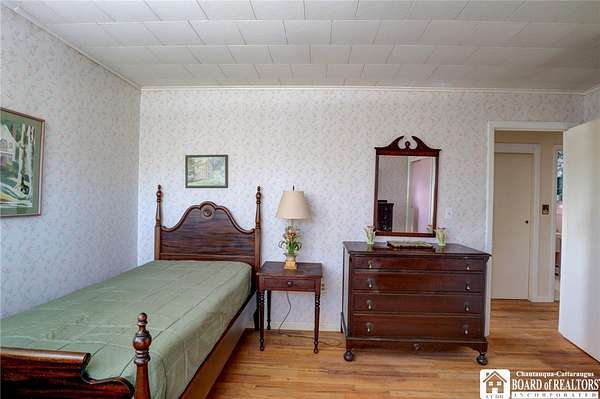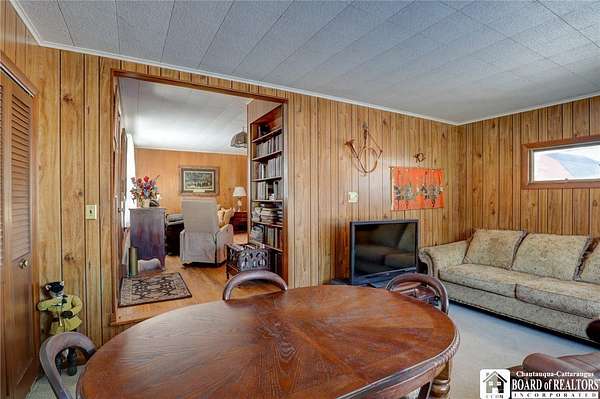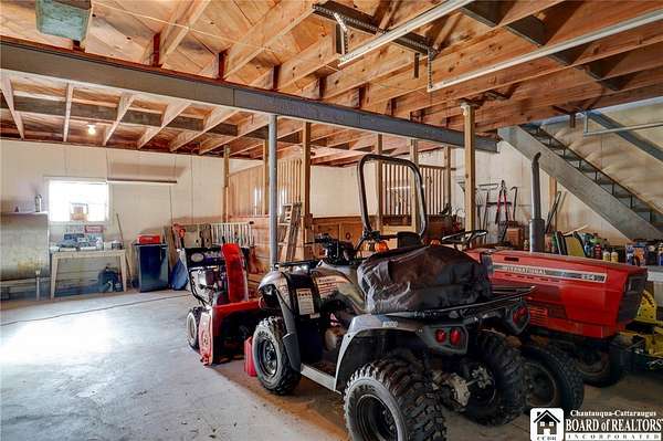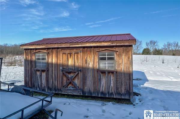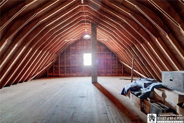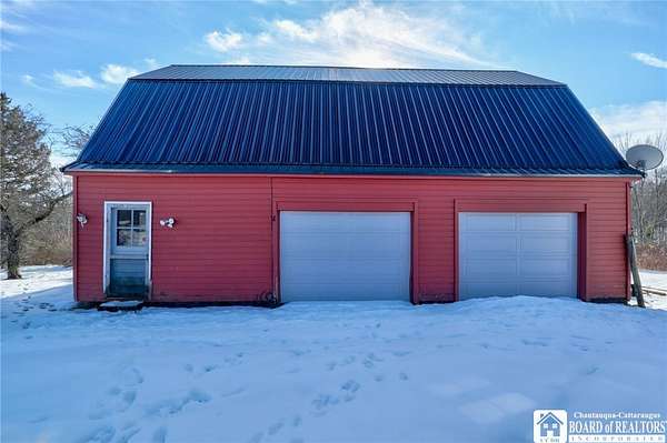 This beautifully maintained two-bedroom home is nestled on 5.5 scenic acres in the sought-after Bemus Point School District, offering timeless character, quality craftsmanship, and peaceful surroundings. Inside, the home features stunning hardwood floors, rich woodwork throughout, and beautiful built-in bookshelves that add warmth, charm, and functionality to the living space. The attention to detail and classic finishes create an inviting atmosphere that truly feels like home. The house is in excellent condition and thoughtfully designed to maximize comfort while showcasing its natural wood elements. Large windows provide lovely views of the surrounding property, allowing you to enjoy the open landscape and wooded areas from inside the home. Outside, a blacktop driveway leads to a large barn/garage located behind the house. The barn includes two overhead doors, concrete floors and a spacious upper level with tall ceilings, a rear stall suitable for a horse or other animals, and a heated finished room that would make an ideal office, studio, or sitting area. One full acre of the 5.5-acre parcel is fully fenced with electric fencing, perfect for a pasture or animals. With its combination of beautiful interior craftsmanship, expansive land, and versatile outbuildings, this property offers a rare opportunity to enjoy country living with character and charm in a highly desirable location