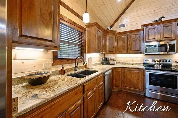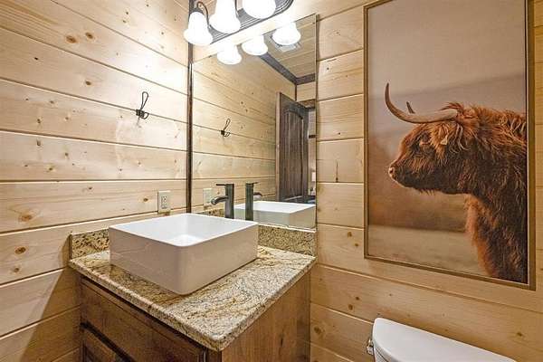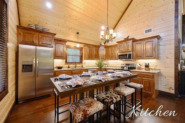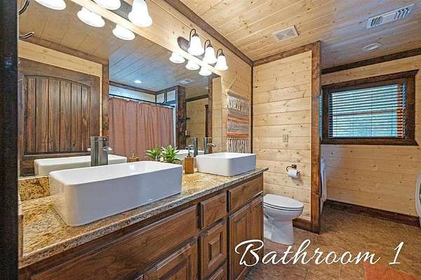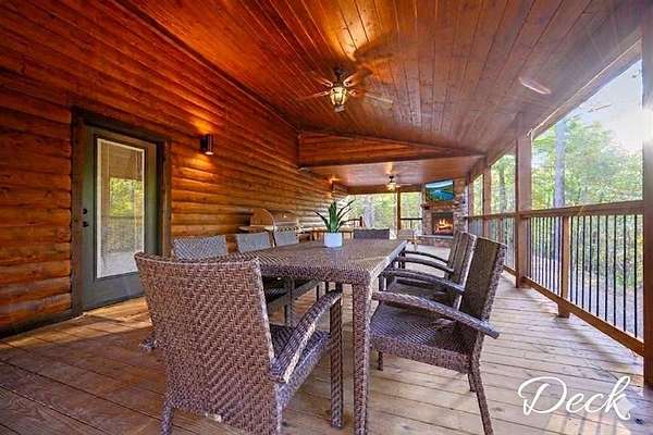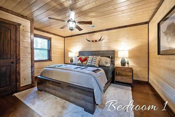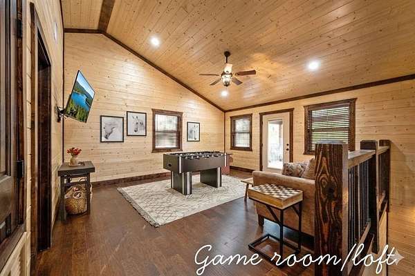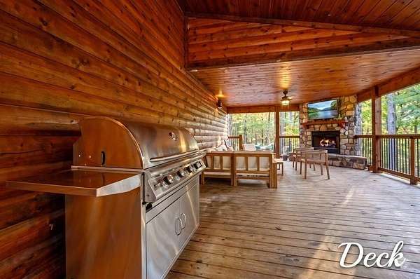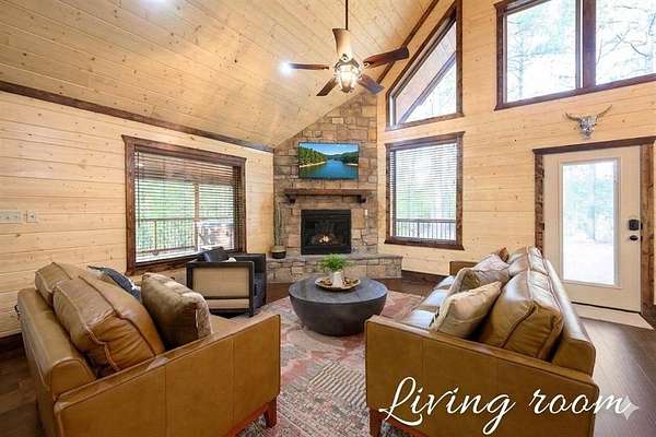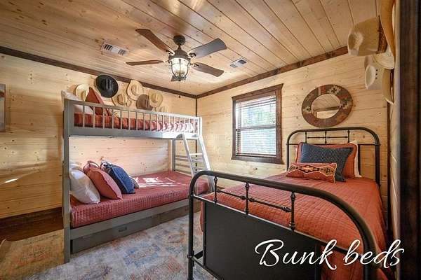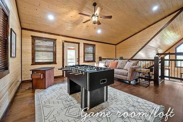 For Sale "The Longhorn Lodge" STR cabin in Broken Bow - Hochatown Oklahoma, set along a stunning seasonal creek, perfect for throwing rocks, enjoying the peaceful ambiance, and splashing in the summer months. Tucked well off the road and surrounded by nature, this 4-bedroom, 3.5-bath cabin offers privacy and a true escape from it all. The expansive covered deck invites you to relax with a large hot tub, outdoor dining area, grill, and a cozy fireplace, all overlooking the wooded landscape and seasonal creek. The cabin is styled with warm wood tones while the open-concept kitchen, living room, and dining area provide plenty of space for gathering. The fully equipped kitchen makes it easy to prepare meals or cater in for convenience. The main level features a king suite with a private ensuite, along with two queen bedrooms that share a hall bath. Upstairs, the loft is perfect for game nights with foosball, board games, and comfortable seating, while the bunkroom just off the loft includes a twin-over-full bunk plus an additional twin bed, along with its own private bath and a convenient half bath on the loft landing. Located close to Broken Bow Lake and Beavers Bend State Park, you can enjoy horseback riding, hiking, and canoeing just minutes away. This inviting retreat offers the perfect blend of rustic character, modern comfort, and outdoor enjoyment, making it an ideal personal getaway or short-term rental opportunity in the heart of Broken Bow-Hochatown.