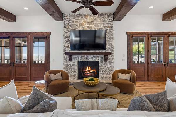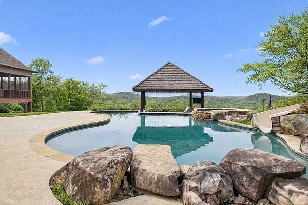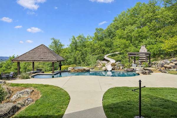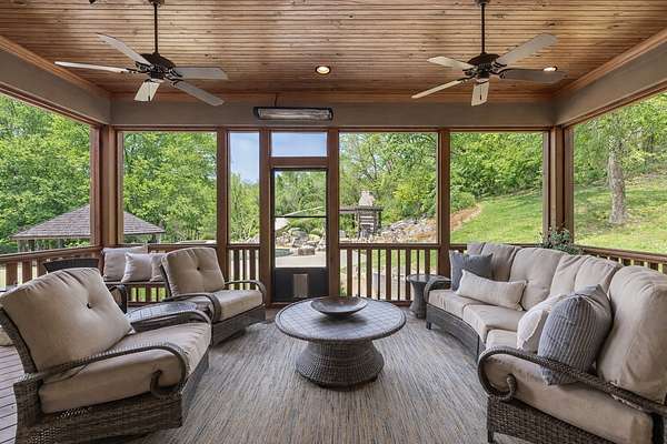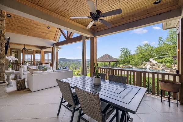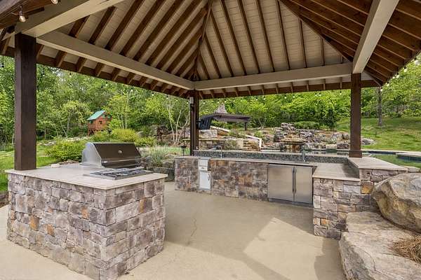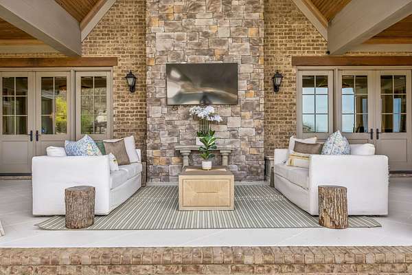 Outdoor living is spectacular. A heated pool & spa anchor the space, w/ 3 glass rock fire pits, grotto w/ waterfall & slide, & outdoor fireplace. The poolside pavilion features a swim up bar & full outdoor kitchen, plus a convenient pool bath. Covered rear porches create seamless indoor/outdoor living, incl. 2 screened spaces off the kitchen & primary suite, plus a vaulted porch off the living room. Outdoor speakers enhance the setting.