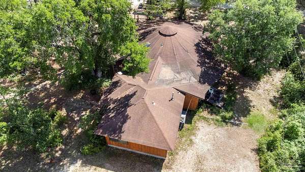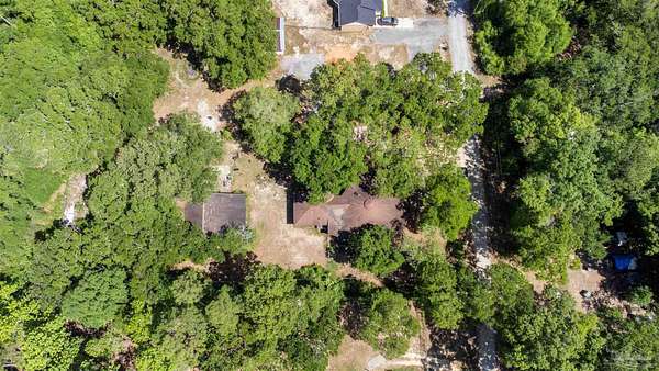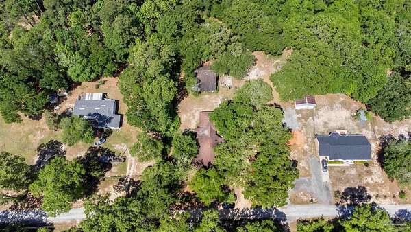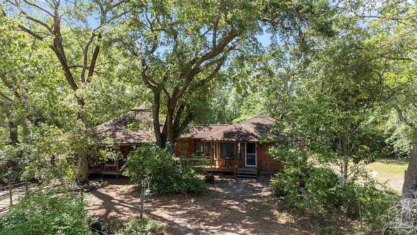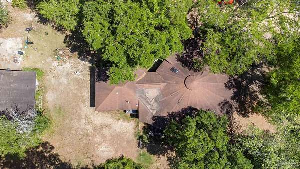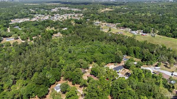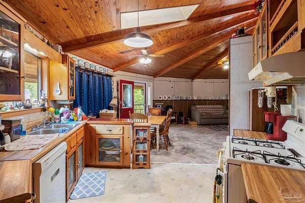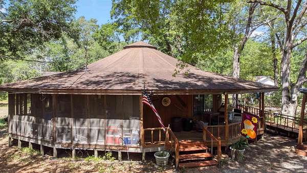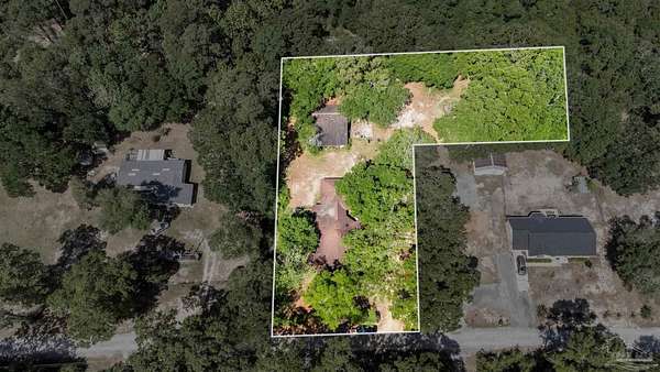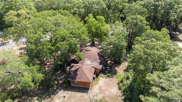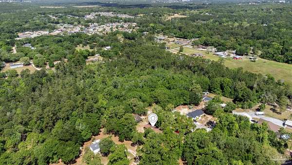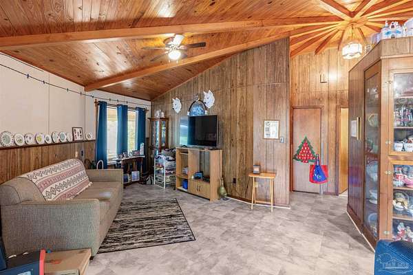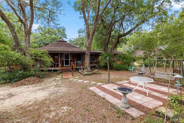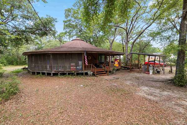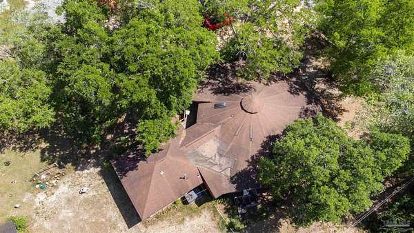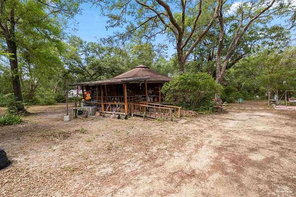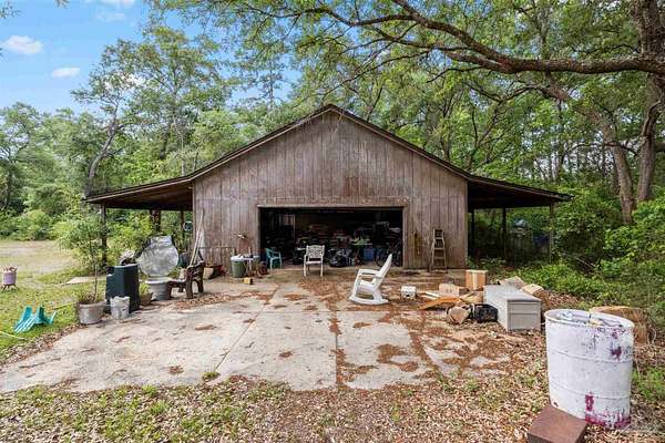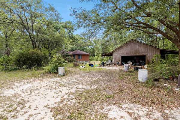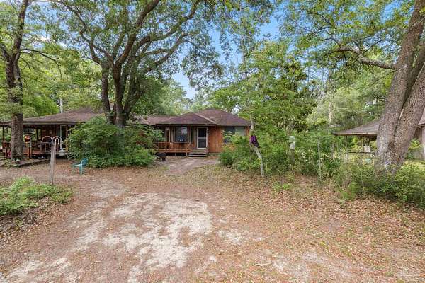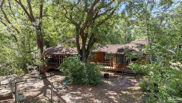 Welcome to "Eagle's Nest" - a one-of-a-kind property with character, space, and charm! Originally designed and built in 1988, this unique home sits on 1.62 acres and truly lives up to its name with its distinctive architectural style and soaring vaulted wood ceilings that create a warm, inviting atmosphere. Inside, you'll find a thoughtfully designed split floor plan featuring 3 bedrooms and 2 full bathrooms, along with an open-concept living space that seamlessly connects the kitchen, dining, and living areas-perfect for both everyday living and entertaining. Natural light pours in throughout the home, and a skylight in the kitchen adds an extra touch of brightness to the heart of the home. The kitchen is complemented by an oversized walk-through pantry with custom built-ins, offering plenty of storage and functionality. Step outside and enjoy your own private retreat-this expansive property features blueberry trees and a variety of flowering plants, creating a peaceful, garden-like setting. For hobbyists or professionals, the 20x20 shop provides the perfect space for projects, storage, or working on vehicles. Additional highlights include: Hot Water Heater (2023) A/C (2025) Sellers are willing to install a new roof prior to closing A mobile home is located at the rear of the property and is not livable and holds no contributory value. Conveniently located near Interstate 10, shopping, dining, and the popular Five Flags Speedway, this home offers both privacy and accessibility. If you're looking for something truly unique with land, character, and functionality-this is it.
