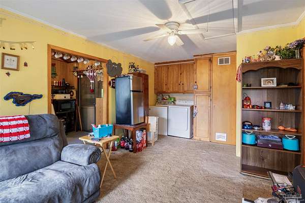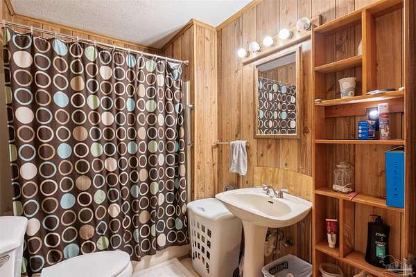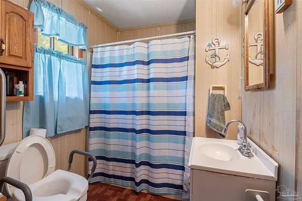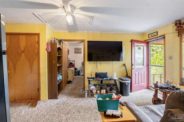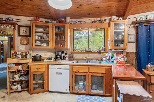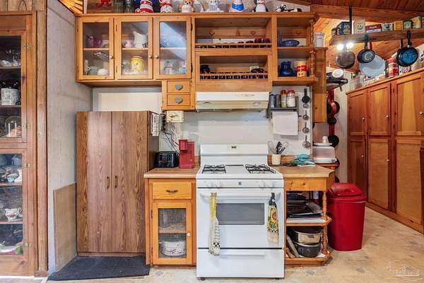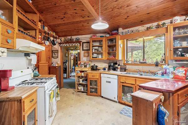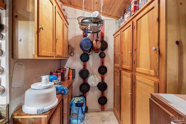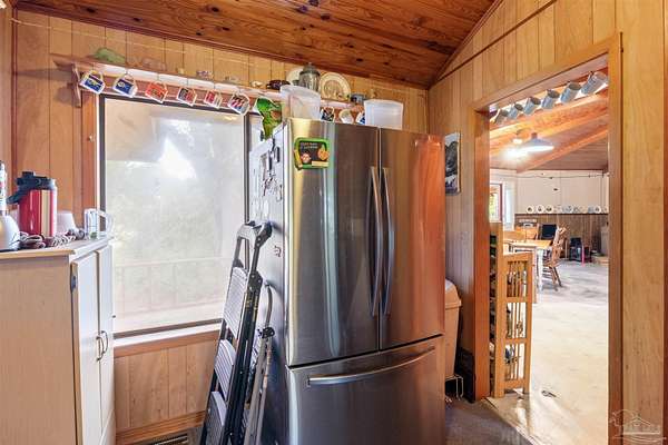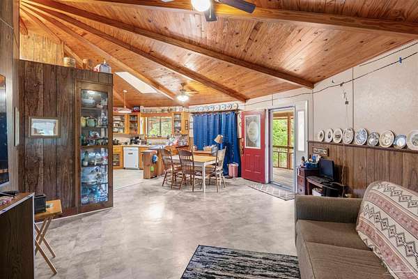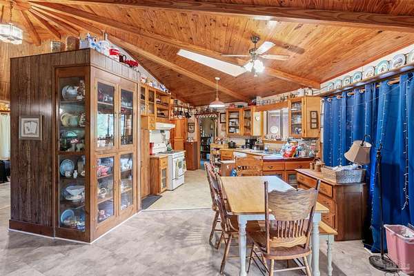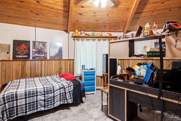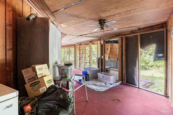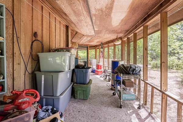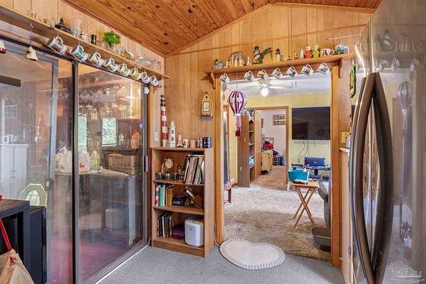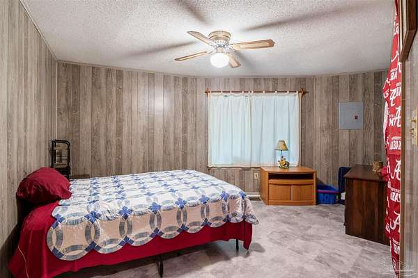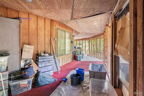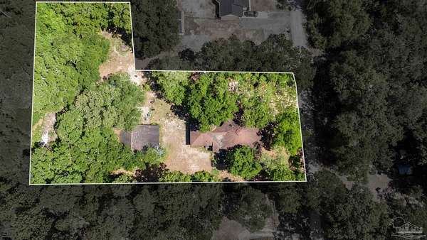 Welcome to "Eagle's Nest" - a one-of-a-kind property with character, space, and charm! Originally designed and built in 1988, this unique home sits on 1.62 acres and truly lives up to its name with its distinctive architectural style and soaring vaulted wood ceilings that create a warm, inviting atmosphere. Inside, you'll find a thoughtfully designed split floor plan featuring 3 bedrooms and 2 full bathrooms, along with an open-concept living space that seamlessly connects the kitchen, dining, and living areas-perfect for both everyday living and entertaining. Natural light pours in throughout the home, and a skylight in the kitchen adds an extra touch of brightness to the heart of the home. The kitchen is complemented by an oversized walk-through pantry with custom built-ins, offering plenty of storage and functionality. Step outside and enjoy your own private retreat-this expansive property features blueberry trees and a variety of flowering plants, creating a peaceful, garden-like setting. For hobbyists or professionals, the 20x20 shop provides the perfect space for projects, storage, or working on vehicles. Additional highlights include: Hot Water Heater (2023) A/C (2025) Sellers are willing to install a new roof prior to closing A mobile home is located at the rear of the property and is not livable and holds no contributory value. Conveniently located near Interstate 10, shopping, dining, and the popular Five Flags Speedway, this home offers both privacy and accessibility. If you're looking for something truly unique with land, character, and functionality-this is it.