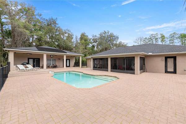 The main home features four generously sized bedrooms plus a dedicated office, all designed within a bright and inviting open floor plan. The spacious living area flows effortlessly into the dining space and a beautifully designed kitchen complete with a breakfast nook, creating the perfect environment for both everyday living and entertaining. Large windows fill the home with natural light, enhancing the open and airy feel throughout. Outdoors, your private retreat awaits. Enjoy the in-ground pool surrounded by elegant pavers and an outdoor kitchen space ideal for hosting gatherings or relaxing under the Florida sun. The expansive acreage provides plenty of room for recreation, animals, or additional storage, all securely fenced for added peace of mind. A detached mother-in-law suite adds tremendous value and versatility, offering its own private bedroom, full kitchen, living room, and bathroom—perfect for guests, extended family, or income-producing potential. The oversized RV and boat garage is a standout feature, providing ample space for large vehicles, equipment, or a workshop.