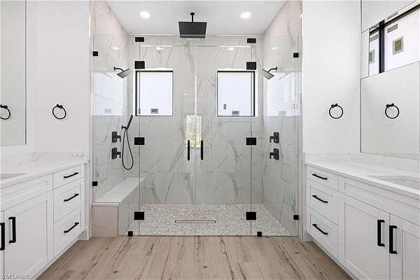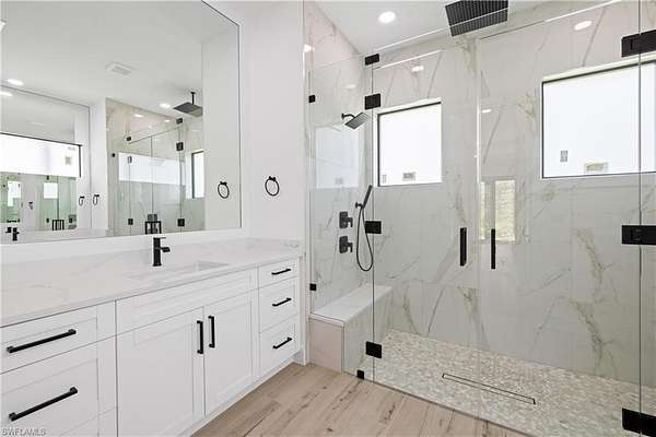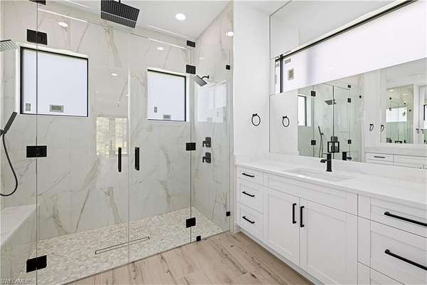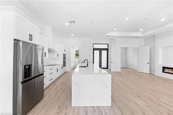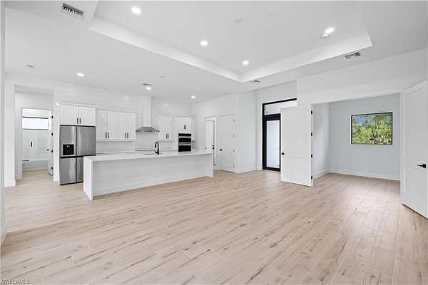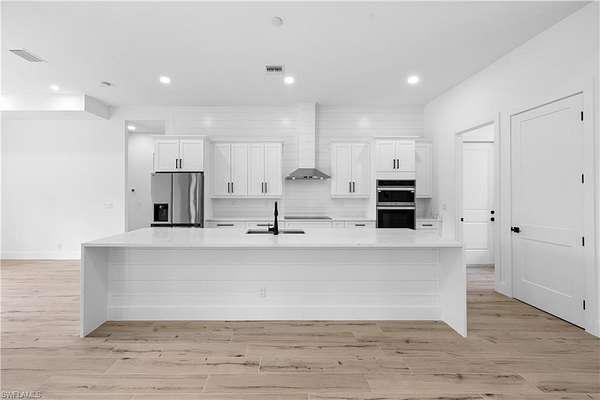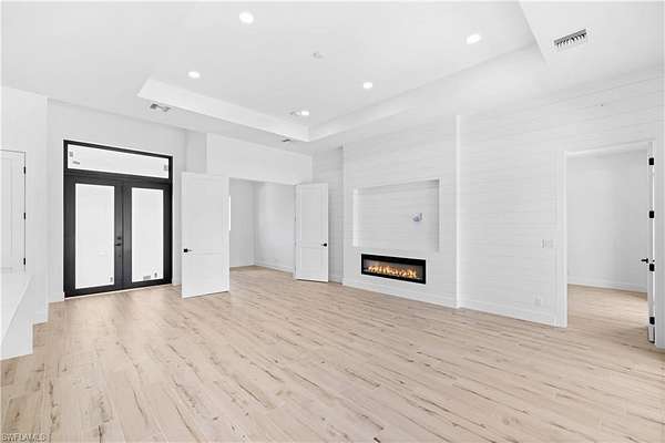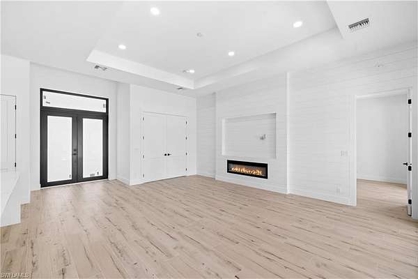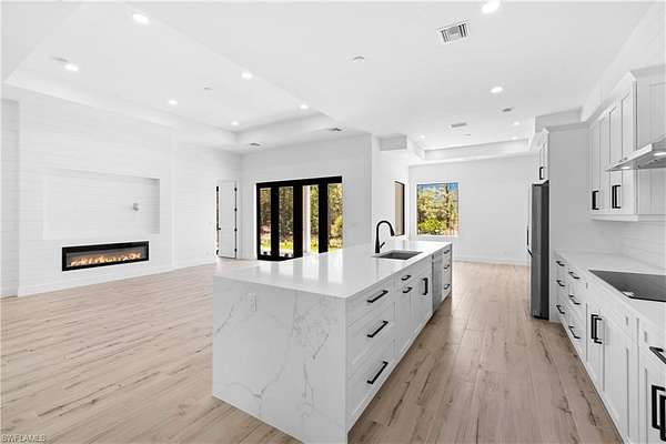 Welcome to your new construction custom built home with sophisticated elegance and upgrades throughout! Upgrades include impact windows and doors throughout, kitchen with HUGE waterfall island, luxurious quartz countertops in kitchen and bathrooms, stainless steel appliances, spice rack, trash pullout, wall oven, cook top and pantry, upgraded laundry with mud room area, large folding and hanging areas, storage drawers and bench seating, entertainment wall with shiplap for built in TV and fireplace, large plank tile throughout, amazing master bathroom with his and her shower areas and a center waterfall, epoxy garage floor, sprinkler system on all grass areas, 16 foot asphalt poured driveway with turnout for two parking spaces and HIGH ceilings throughout (11 feet in main area, 12 feet in coffered ceiling and 14 feet in the foyer entrance).