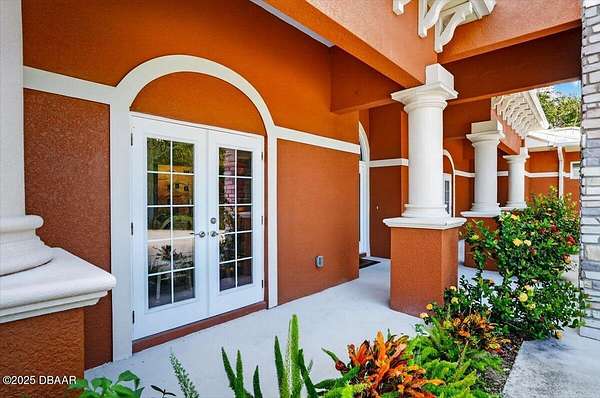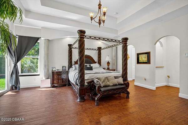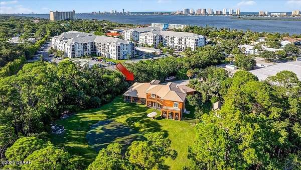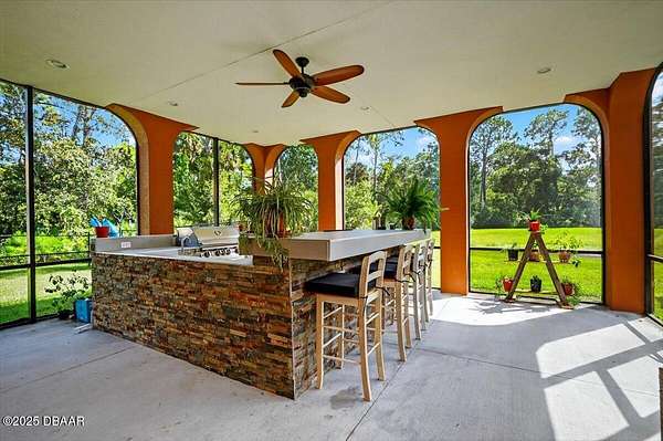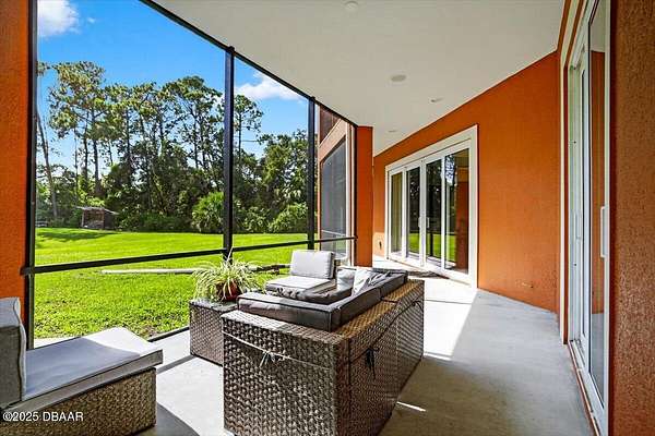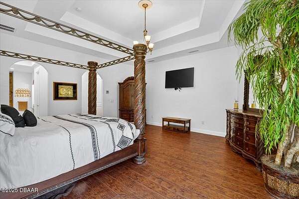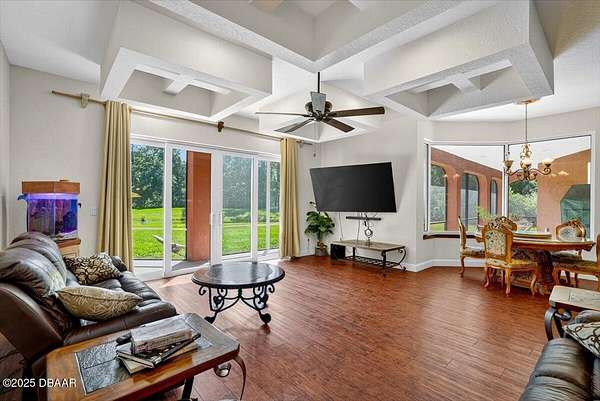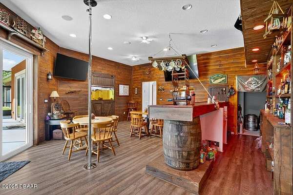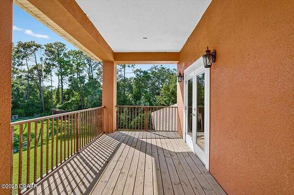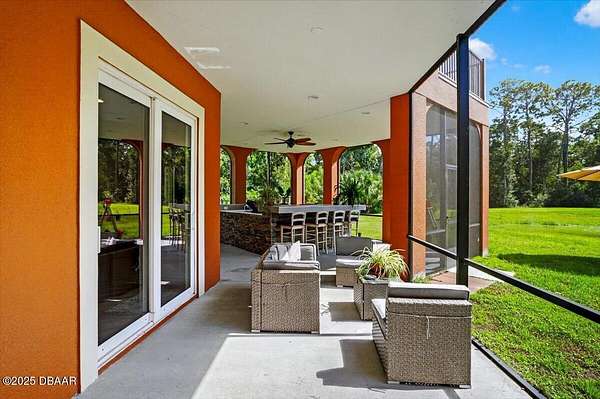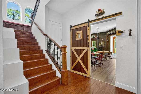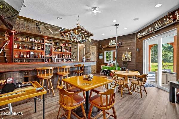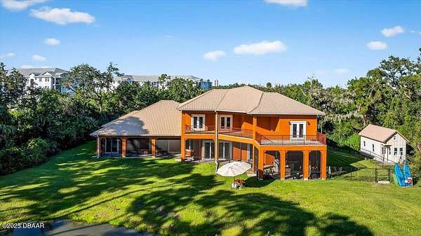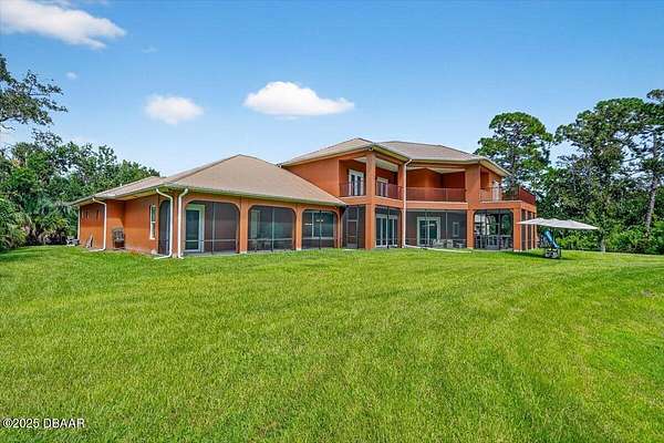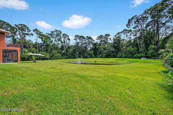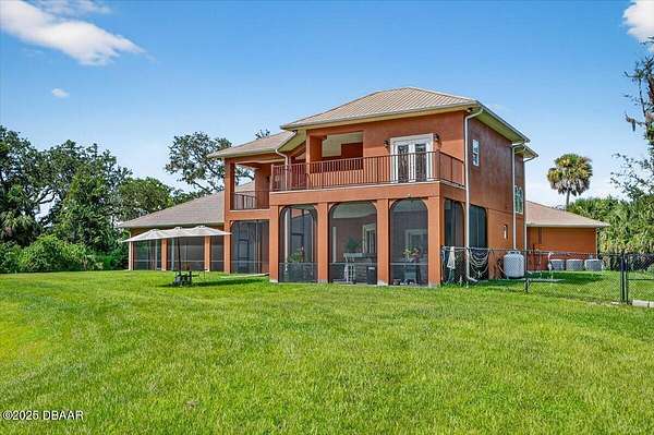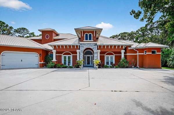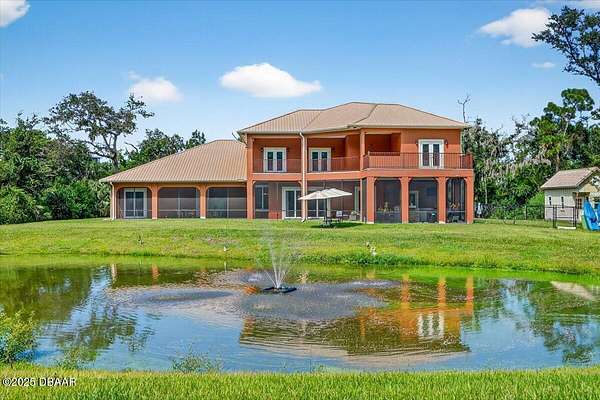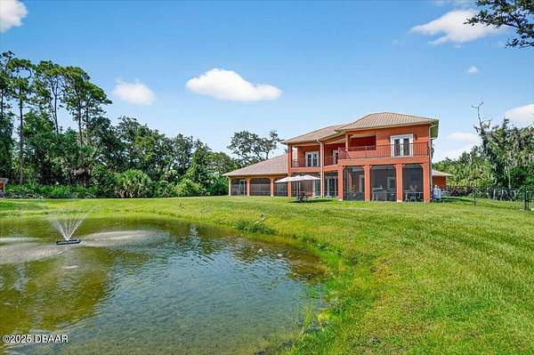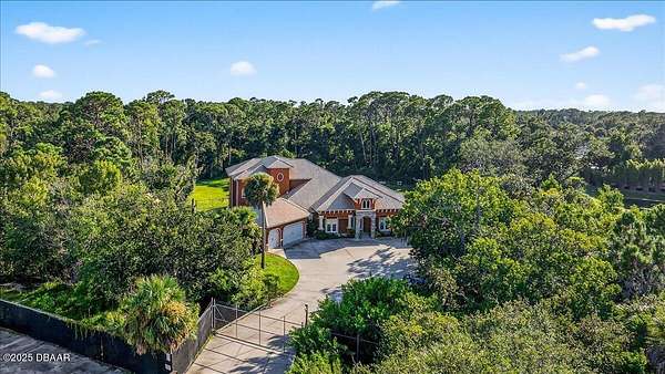 Tucked away on over 3 acres of secluded paradise in the center of town and just minutes from the beach, this one-of-a-kind estate is a true sanctuary. Thoughtfully designed and custom built by the current owner, the home blends refined luxury, family-friendly function, and storm readiness into one unforgettable property. From the street, a private gated entrance gives little indication of the spectacular retreat that lies within. Once inside, you're welcomed to a sprawling 4,766 sq ft residence featuring 4 bedrooms, 3.3 bathrooms, a 3-car garage, and a wealth of surprises from a custom-built tiny home to a fully stocked pond with tree-lined privacy and creeks on two sides. Step inside and you'll find details everywhere: a formal living room turned into a gallery space, complete with a custom ''family tree'' mural, and a chef's kitchen built to impress. Highlights include a 6-burner propane range with commercial-grade venting, double ovens, pot filler, custom cabinetry, granite counters, a center island, breakfast bar, and even a dedicated coffee station. The first floor also offers special touches, with a private owner's suite designed as a true retreat with dual walk-in closets, spa-style rainforest shower, soaking tub, and dual vanities. A cleverly hidden office with its own private outside entrance or secret bookcase passageway adds even more character. Entertainment takes center stage with the custom-designed Pirate Bar, complete with karaoke, rum barrels, and a built-in fish tank showcasing a sunken pirate ship. Upstairs, the excitement continues with a dramatic chandelier-lit landing, a cozy sitting area, and a multi-level movie theater with a smooth-finish projection wall and surround sound. Guest rooms each feature ensuite baths and private balconies overlooking the tranquil grounds. Outdoors, the backyard lives like a personal resort, with a screened entertainment area, full Florida summer kitchen, and picturesque stocked pond. Energy efficiency comes standard, thanks to a heavy-gauge metal roof, insulated windows and doors, and foam attic insulation keeping utility costs impressively low. For peace of mind, the home is ready for any storm with a generator hookup and hurricane-rated electrical panel. This hidden paradise is more than a home, it's a lifestyle. Whether you envision a private family retreat, or an entertainer's dream estate, the options here are endless.