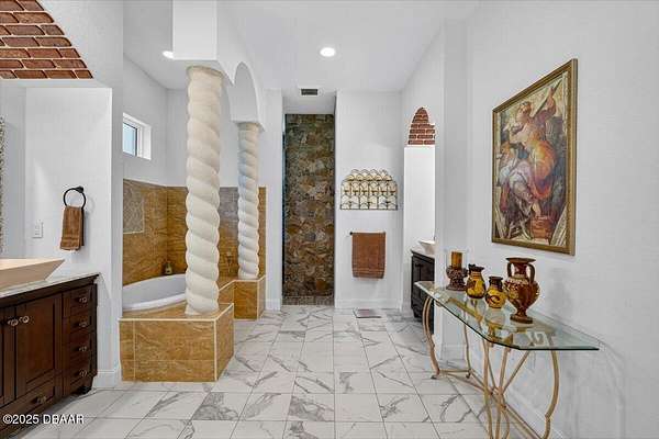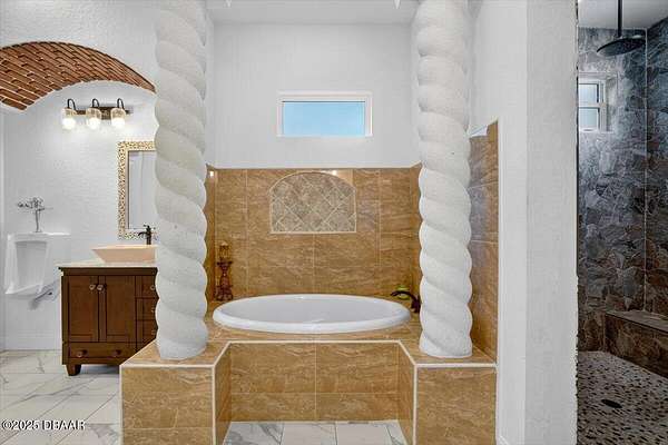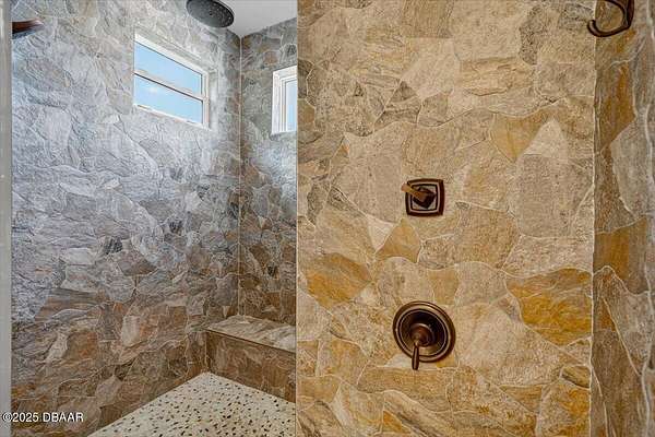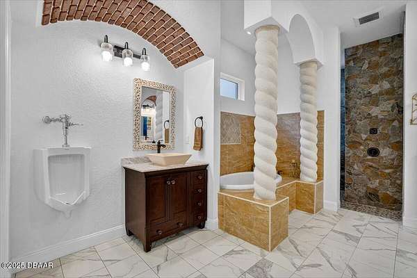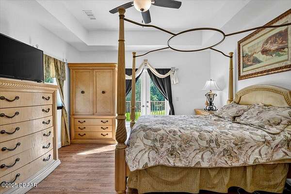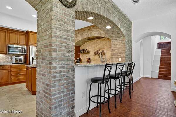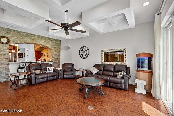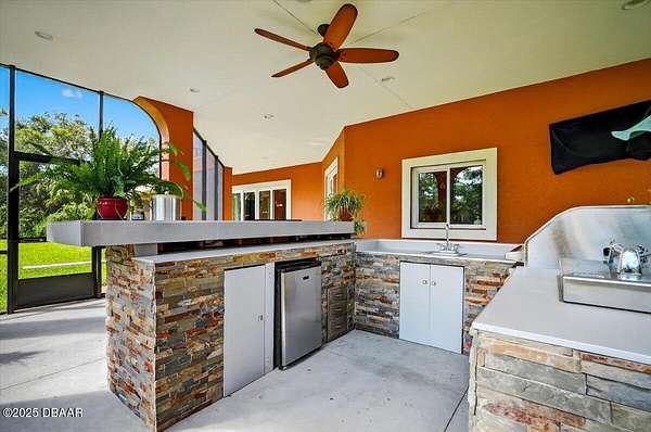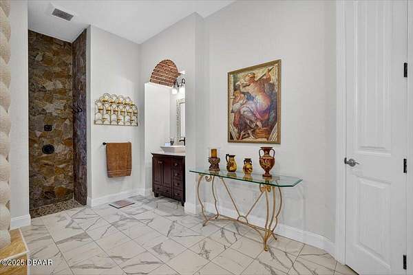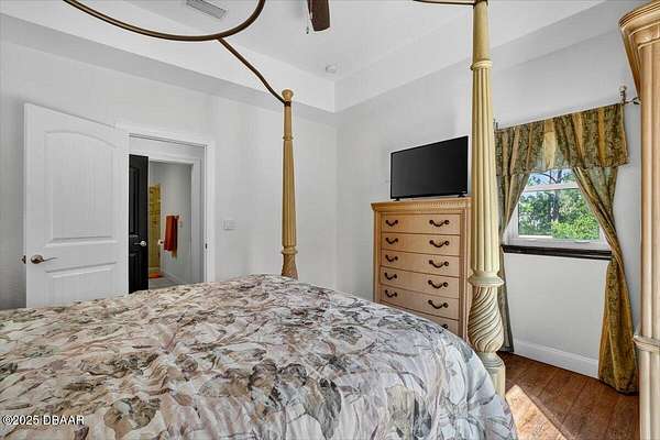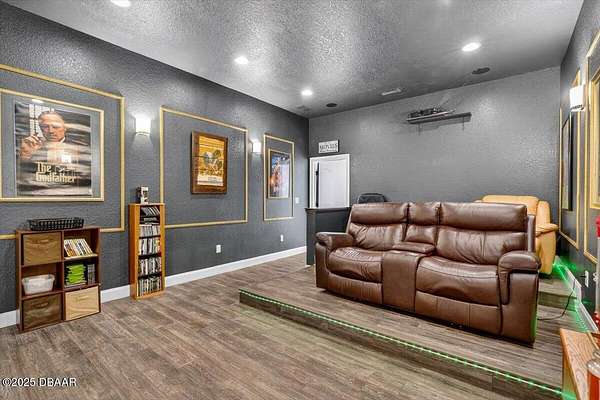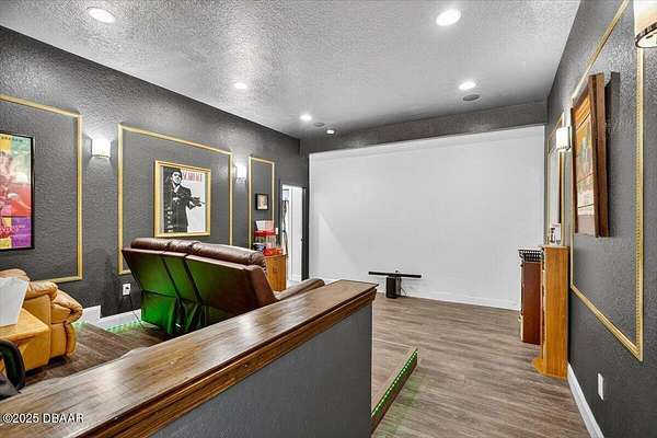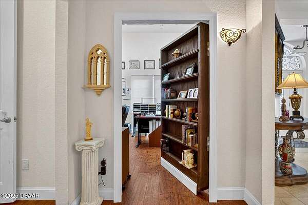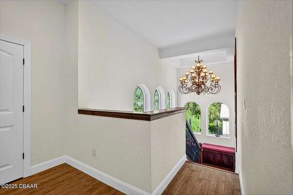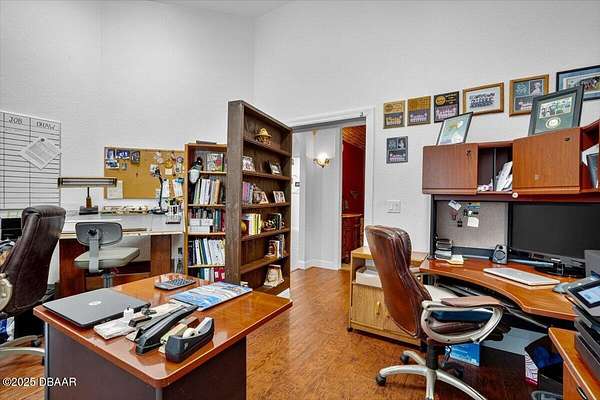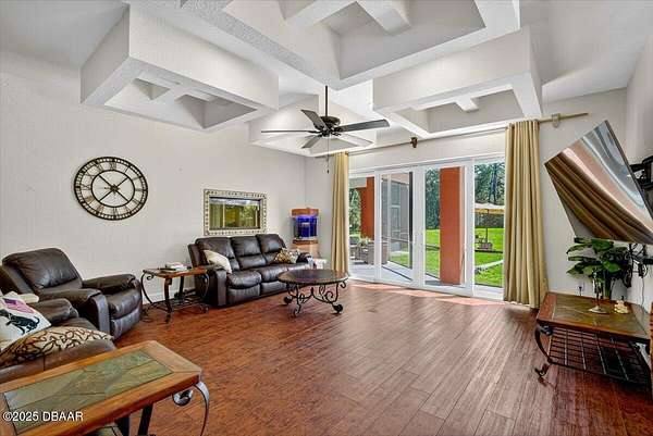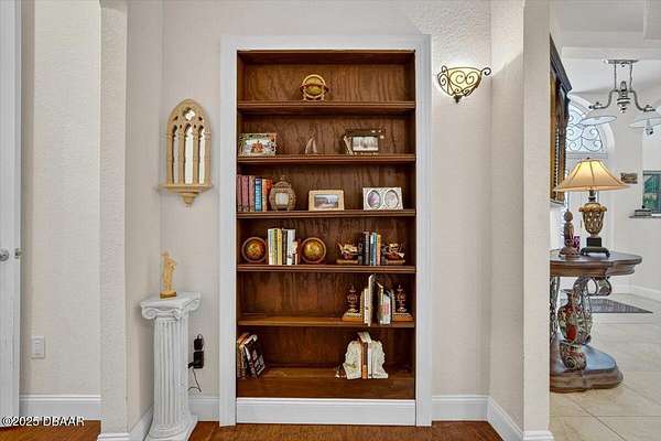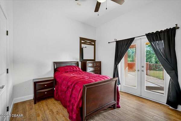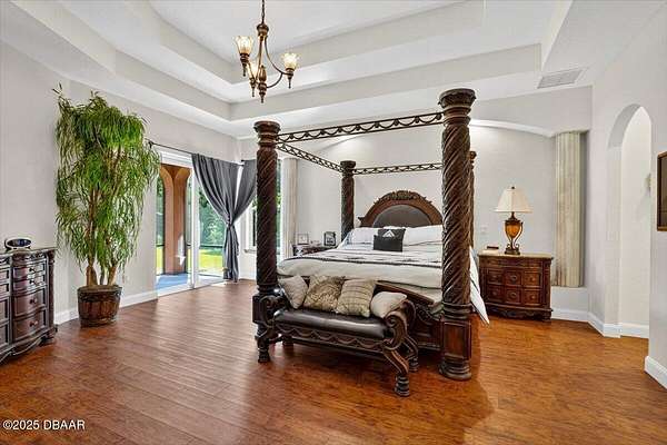 Tucked away on over 3 acres of secluded paradise in the center of town and just minutes from the beach, this one-of-a-kind estate is a true sanctuary. Thoughtfully designed and custom built by the current owner, the home blends refined luxury, family-friendly function, and storm readiness into one unforgettable property. From the street, a private gated entrance gives little indication of the spectacular retreat that lies within. Once inside, you're welcomed to a sprawling 4,766 sq ft residence featuring 4 bedrooms, 3.3 bathrooms, a 3-car garage, and a wealth of surprises from a custom-built tiny home to a fully stocked pond with tree-lined privacy and creeks on two sides. Step inside and you'll find details everywhere: a formal living room turned into a gallery space, complete with a custom ''family tree'' mural, and a chef's kitchen built to impress. Highlights include a 6-burner propane range with commercial-grade venting, double ovens, pot filler, custom cabinetry, granite counters, a center island, breakfast bar, and even a dedicated coffee station. The first floor also offers special touches, with a private owner's suite designed as a true retreat with dual walk-in closets, spa-style rainforest shower, soaking tub, and dual vanities. A cleverly hidden office with its own private outside entrance or secret bookcase passageway adds even more character. Entertainment takes center stage with the custom-designed Pirate Bar, complete with karaoke, rum barrels, and a built-in fish tank showcasing a sunken pirate ship. Upstairs, the excitement continues with a dramatic chandelier-lit landing, a cozy sitting area, and a multi-level movie theater with a smooth-finish projection wall and surround sound. Guest rooms each feature ensuite baths and private balconies overlooking the tranquil grounds. Outdoors, the backyard lives like a personal resort, with a screened entertainment area, full Florida summer kitchen, and picturesque stocked pond. Energy efficiency comes standard, thanks to a heavy-gauge metal roof, insulated windows and doors, and foam attic insulation keeping utility costs impressively low. For peace of mind, the home is ready for any storm with a generator hookup and hurricane-rated electrical panel. This hidden paradise is more than a home, it's a lifestyle. Whether you envision a private family retreat, or an entertainer's dream estate, the options here are endless.
