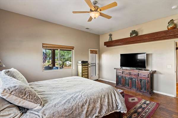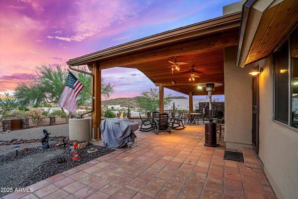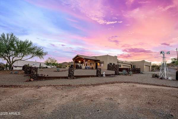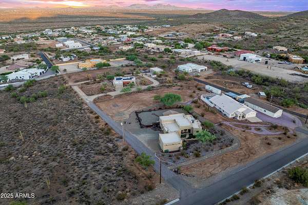 Desert Hills bundle sale includes two homes on 3.65 acres with city water and no HOA. Both offer mountain and city views from expansive patios and newer 50 year roofs. Main home is 4 bed/2 bath with wood beams, Saltillo tile, hardwood in primary, and wood-burning fireplace. Second home is 3 bed/2 bath that has been replumbed, water heater, and softener. Property features two 2-car attached garages, two additional outbuildings, and a 2024 RV pad with electric and septic. Zoned for horses and near TSMC corridor, hiking, and Lake Pleasant.