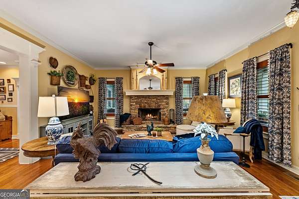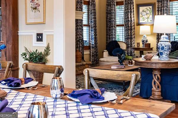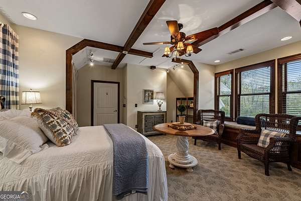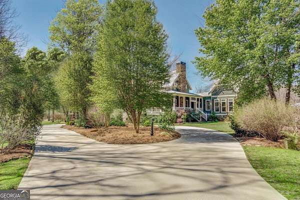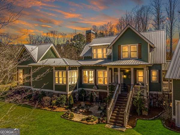 STUNNING SOUTHERN LIVING DESIGN WITH CREEK FRONTAGE AND MOUNTAIN VIEW! This architecturally designed masterpiece captures timeless Southern charm and modern comfort on one of the most breathtaking creekfront settings in North Georgia, offering 3.31 private acres with 1,200 feet of pristine Boardtown Creek frontage and year-round mountain views. The grounds are extraordinary with a creekside stone courtyard, gazebo, she-shed, garden area, and wooded backdrop that create a true sanctuary. Inside, the home radiates warmth and character with stunning custom trim work, three fireplaces, and inviting living spaces throughout. The well-appointed kitchen features an enormous island, brand-new GE Cafe Collection appliances, abundant cabinetry, a walk-in pantry, and a dining area with views of the creek. The living room exudes comfort and charm with a wood-burning fireplace, while a gentleman's library with fireplace and built-ins sets the stage for a quiet read or evening nightcap. The primary suite on the main level offers his-and-hers closets and an "oh la la" bath with a corner soaking tub. Powder room and laundry also conveniently located on the main floor. Upstairs, the fourth bedroom doubles as a gathering room with fireplace. The detached two-car garage includes a large finished bonus room above-ideal for a home office, studio, or craft space. Enjoy true Southern living while sipping sweet tea on the beautiful wraparound porch overlooking the picturesque property. No worries about power outages with the whole-house generator, plus fiber internet, paved road access, gated entry, and no HOA. Perfectly situated between Ellijay and Blue Ridge, just minutes from Whitepath Golf Course, Roo Vineyards, and Cress Creek Farm. Full-time residents age 65 and older are exempt from school tax. (FURNISHINGS Available on separate bill of sale.)