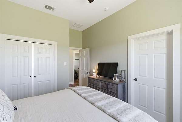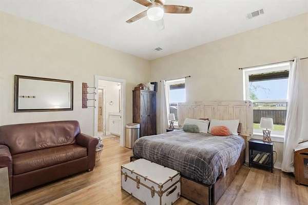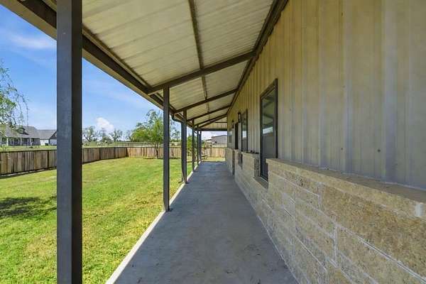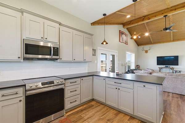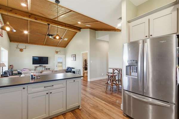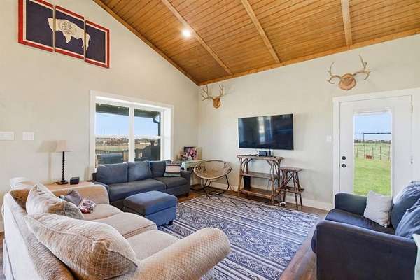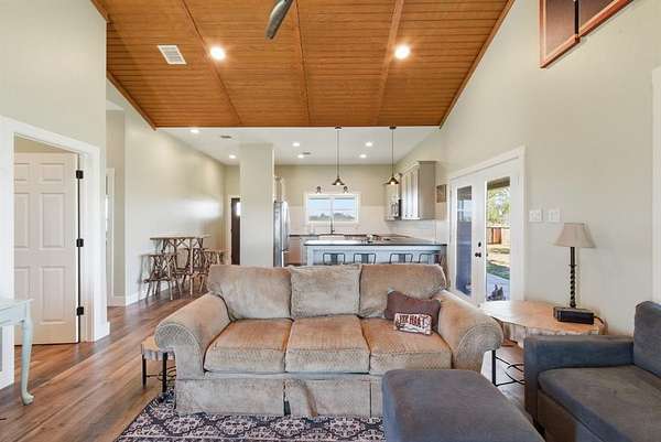 The 3-bedroom, 2-bath metal home is thoughtfully designed with an inviting open-concept layout. Step inside to a spacious living area highlighted by stunning vaulted wood ceilings, abundant natural light, and attractive luxury vinyl plank flooring throughout the main spaces.