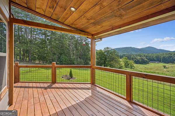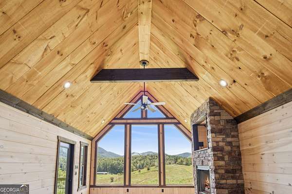 Welcome to 335 Mountain Road in Morganton, GA-completed in 2023 and just 10 minutes from Blue Ridge, this stunning mountain retreat sits on 1.51 fenced-in acres with rolling pastureland and miles of breathtaking mountain views. Inside, you'll find rustic charm with soaring beamed wooden ceilings, floor-to-ceiling windows, a cozy stone fireplace, and a kitchen with stainless steel appliances. The main level offers 2 bedrooms, including a master suite with deck access and both bathrooms featuring large tiled showers, while the spare bedroom upstairs has a private balcony, and the master connects to the front deck with its own outdoor fireplace. The finished basement level includes 2 additional bedrooms, a bathroom, and a kitchenette, perfect for guests, extended family, or rental opportunities. With outdoor living at its finest and a storage shed for convenience, this property is the ideal blend of comfort, beauty, and serenity-come make it yours today!