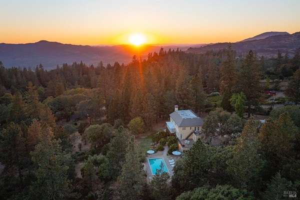 This custom well-built, French-inspired home overlooks Cade Vineyards and has ideal soils for planting a few acres of vineyard in the Howell Mountain AVA. Just 10 minutes from St. Helena and fully furnished, a buyer can move right in! The sprawling estate on 5 acres surrounded by renowned wineries and surrounded by lush greenery, features an elegant private drive, swimming pool, manicured gardens, and expansive patios. The 3-story home boasts a grand 2-story entry with a foyer that opens to a dramatic staircase to bedrooms, an elevator and leads into the Living Room and enclosed sun porch. The 3 car garage opens to the incredible wine cellar , media room, gym and access to the beautiful pool and gardens. The impeccable detail of the interiors features high ceilings and natural light. The Chef's Kitchen has timeless finishes and custom cabinetry and outfitted with high-end appliances, walk-in pantry, and a Breakfast Room. Upstairs the coffered ceiling Primary Suite has two generous walk-in closets and an expansive ensuite Bath. Three more guest Bedrooms, 2 Baths and Office adorn this floor. The detached Guest House has one Bedroom, 1.5 Baths, Living Room, Kitchen, and its own private Veranda.