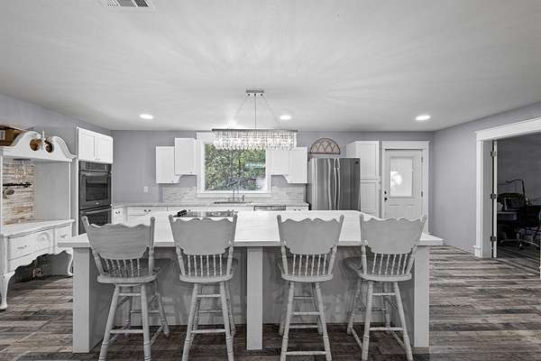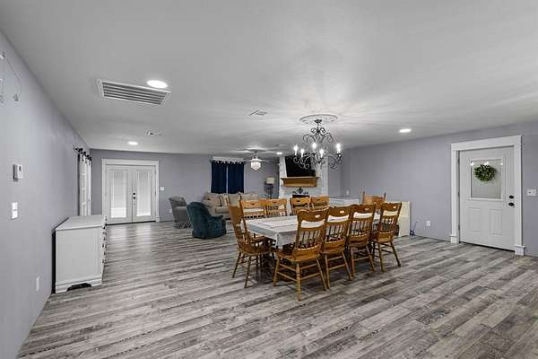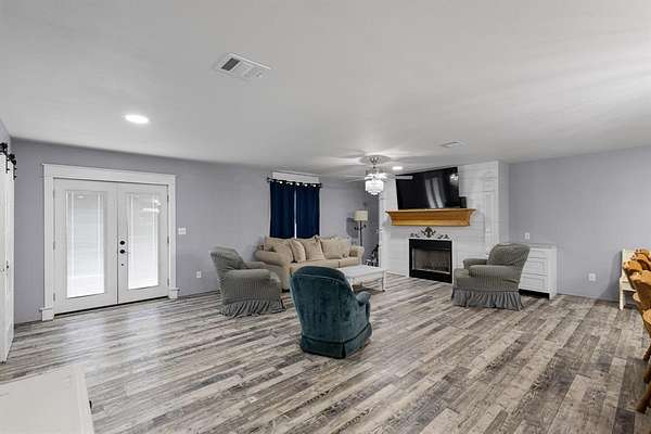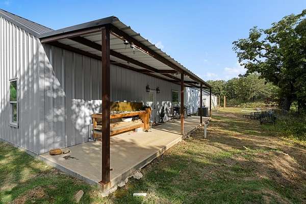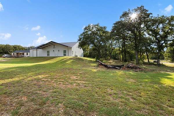 Wake up to the sounds of nature as you step onto your long concrete porch with a warm cup of coffee, and take in the scenery of your 1.81-acre retreat. This custom-built white barndominium blends classic farmhouse charm with a touch of modern chic, offering comfort, functionality, and a peaceful lifestyle just minutes from Lake Amon G. Carter. With 2 bedrooms and 1.5 baths, this home was thoughtfully designed for both style and accessibility. The open-concept living, kitchen, and dining area features beautiful decorative lighting and a clean, neutral palette perfect for any taste. At the heart of the home is an oversized island kitchen with a butler's pantry, crisp white cabinetry, stainless appliances, and ample space to entertain or cook for the family. Sliding barn doors lead into the primary suite, which includes a large walk-in closet, in-room laundry area, and a spa-inspired shower with striking black-and-white floors. The sellers designed the home with wheelchair accessibility in mind. Outside, enjoy the concrete porch in the back, with a gas line and water access already in place for your future outdoor kitchen. Working from home? You'll appreciate the 64-ft internet tower on-site, currently connected to Lakeside Connections for fast, reliable service. Additional features include an 85-gallon well with softener (located in the garage to prevent winter freezing), a tankless propane water heater, and electricity through Wise Electric Co-op. The oversized garage offers flexibility for 2 vehicles, storage, or workshop use. The property has road access on three sides, with the rear heavily wooded for privacy, exploring, or future trails. Located just 9 minutes from Lake Amon G. Carter, this is more than a house--it's a lifestyle for those seeking the perfect mix of new construction feel, country charm, and peaceful living near the lake. Whether you're settling down or starting fresh, this stunning barndo is the opportunity you've been waiting for.