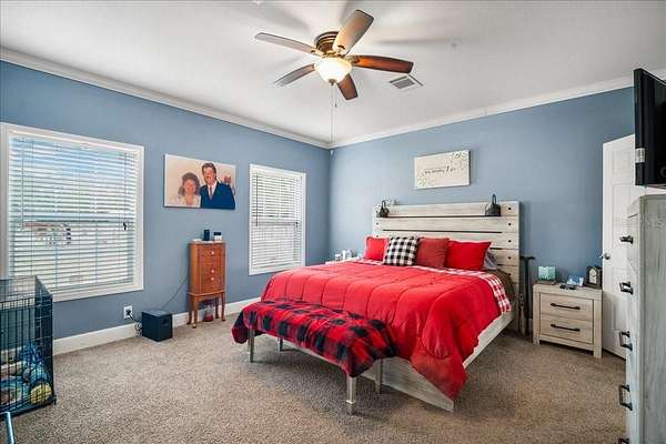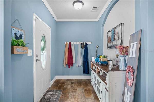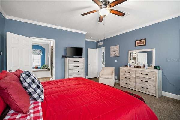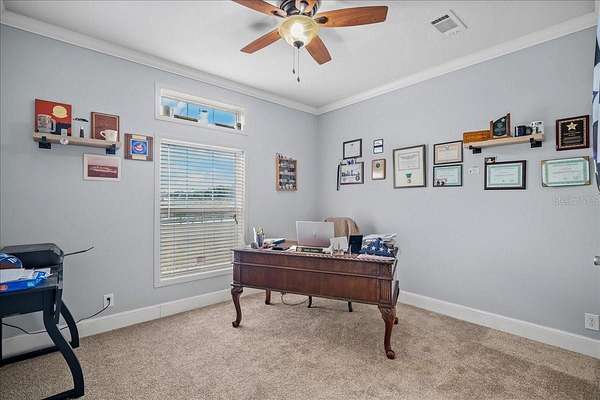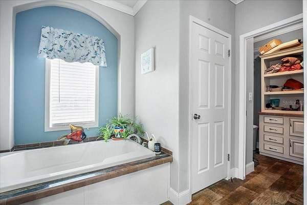 - Built-In Features, Ceiling Fans(s), Coffered Ceiling(s), Crown Molding, Eat-In Kitchen, Kitchen/Family Room Combo, Living Room/Dining Room Combo, Open Floorplan, Primary Bedroom Main Floor, Solid Wood Cabinets, Tray Ceiling(s), Walk-In Closet(s), Window Treatments