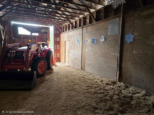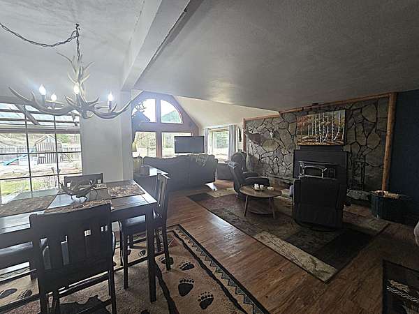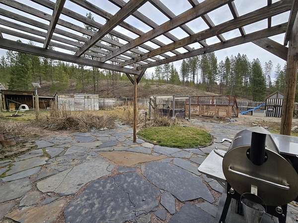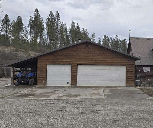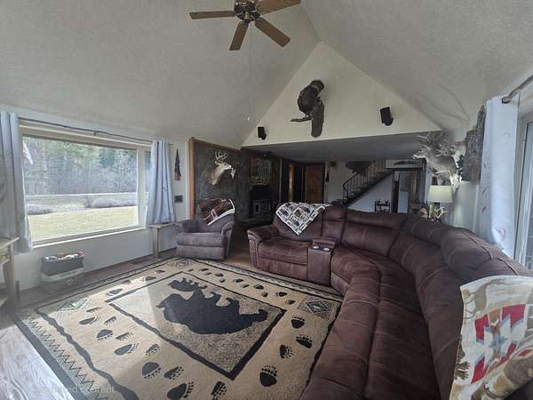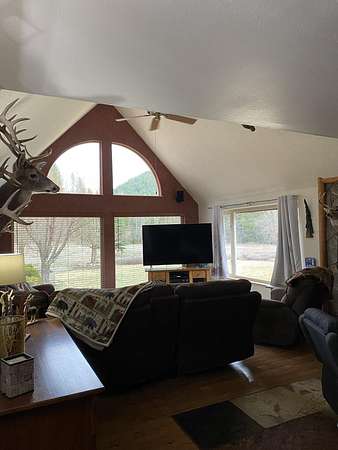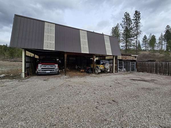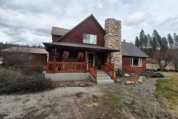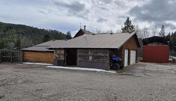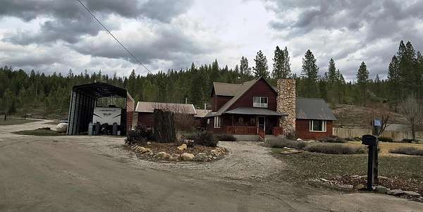 Experience the serenity of this secluded 10-acre equestrian estate nestled in the picturesque Huckleberry Mountains. This property is a sanctuary for both horses and their caretakers, offering a blend of comfort and functionality. Step inside the farmhouse-inspired home, where an open-concept layout creates a welcoming atmosphere. The expansive living area, adorned with vaulted ceilings and open gable windows, bathes the room in natural light-even on snowy days, making it feel as though you're living inside a snow globe. The kitchen boasts an inviting dining nook, perfect for cozy meals and gatherings. On the main floor, you'll find a main suite, additional bedroom, dedicated office space, guest bathroom. Upstairs, 2 more bedrooms and another bathroom provide ample accommodations, complemented by generous storage and convenient access to the attached garage. Beyond the home, the property features a 2,664 sq ft barn equipped with a tack room, hay storage. + additional outbuilding & Amenities