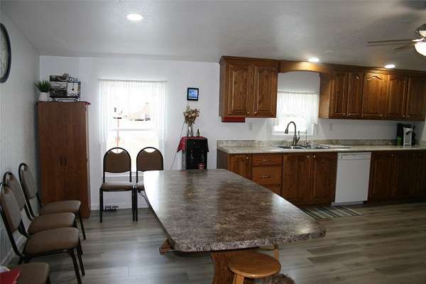GREAT FAMILY HOME!!! EXCELLENT CONDITION!!! This home sits on approximately 2 acres. It has 3 bedrooms up & 1 makeshift down,. 2 bathrooms up. NEW flooring has been installed thru-out the upstairs.. Lots of potential here with a full unfinished basement that has heated floor pipes installed, just needs the HWH. The well is shared, but seller will possibly put in a new well for the buyer. Check out th 35' x 50' bldg. that has an office, bathroom. heat and room to have your own shop, work on your equipment or store some of your farm equipment. Located not far from Hwy.56, so there is good access to town, Dodge City, Sublette, or a any other town!