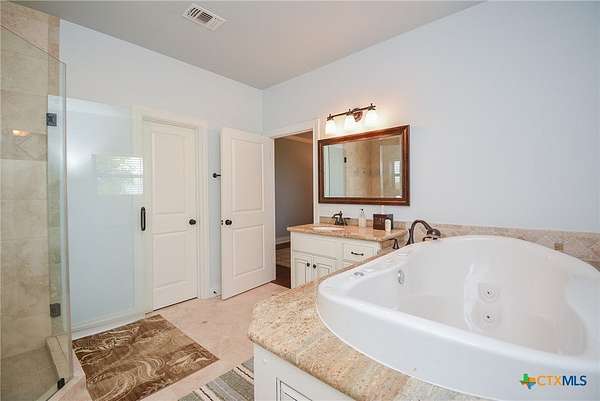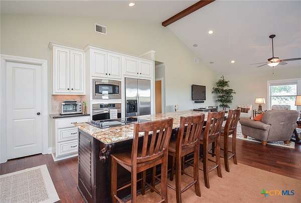 - All Bedrooms Down, Bedroom On Main Level, Breakfast Area, Built In Features, Ceiling Fans, Crown Molding, Custom Cabinets, Handicap Access, High Ceilings, Jetted Tub, Living Dining Room, Open Floorplan, Pull Down Attic Stairs, Recessed Lighting, Separate Shower, Smart Thermostat, Tub Shower, Vanity, Vaulted Ceilings, Walk In Closets, Window Treatments