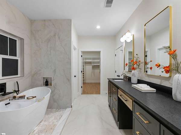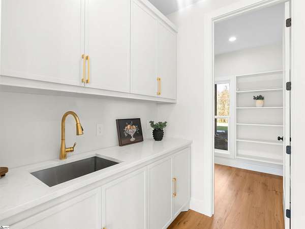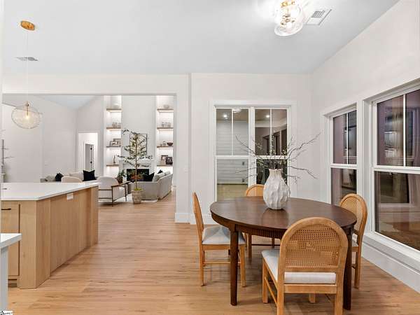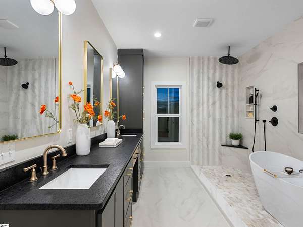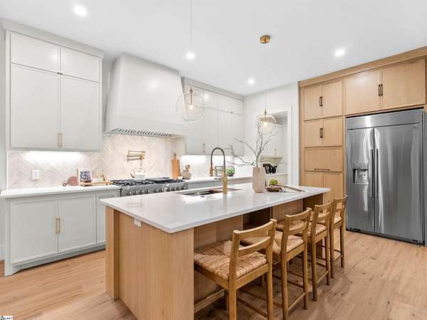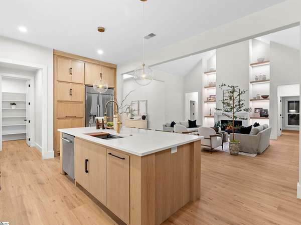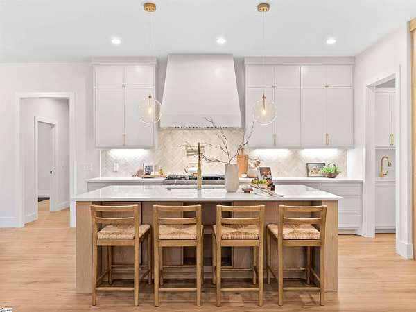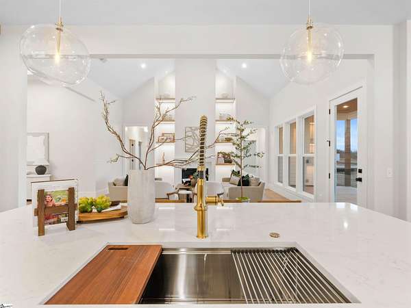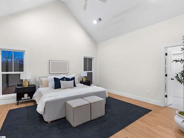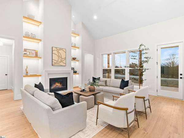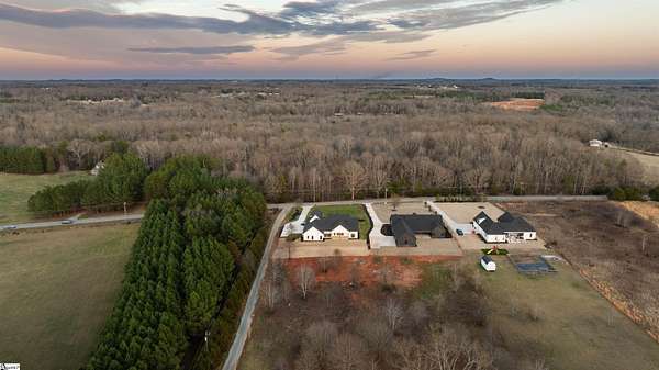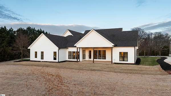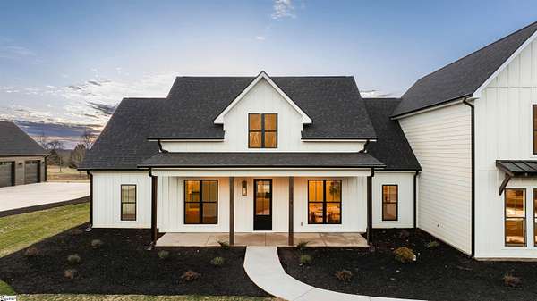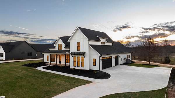 Welcome home to Sunset Acres, a residence that brings multiple generations together. This newly crafted farmhouse stands tall as you pull in to the long paved driveway, occupying 2 acres. Drawing near the entrance, a deep stained tongue and groove patio with a copper gas lantern ushers your arrival. Inside, a foyer draws you into a layout that lives mostly on one level, where movement feels natural and unhurried. Coffered ceilings at twelve feet create a subtle frame for the formal dining. A great room opens wide with vaulted ceilings climbing up to twenty feet. A fireplace lined with custom shelves holds books or treasures under soft, integrated lighting. The kitchen stands as the heart, centered around a quartz island and wrapped in two-tone cabinetry. A built-in refrigerator and concealed microwave hide seamlessly, while a large hood hangs over a ZLINE 8 burner range, a double oven, and a pot filler, ready for any recipe. A café bar with prep sink ready for quick pours in the morning and afternoon pick-me-ups. Beyond, a scullery tucks away everyday messes, keeping the rhythm smooth in the kitchen. Four bedrooms anchor the main floor, including one ensuite for added seclusion. The primary bedroom echoes the home’s airy feel with its own vaulted ceiling and a built-in closet system that organizes life neatly. A discreet closet door connects directly to the laundry room, simplyfing daily flow. After a long day, the primary bath offers a sancuary esape with a freestanding tub and a cascading rainfall shower. A dedicated makeup station built into the vanity with an adjoining linen storage is practical for everyday life. Upstairs, a fifth bedroom transforms into a self-contained retreat. Ideal for an elder, guest or returning family member, with its own kitchenette and full bath, fostering independence. This setup nurtures a multigenerational concept, creating a household that feels both united and respectful of individual needs. Out back, a dark stained tongue-and-groove ceiling hovers over a 24x14 patio, ready for an outdoor kitchen. This 2 acre parcel allows for a variety of recreational hobbies, a garden bed turning soil to blooms, or even a pool to bring the family together for summer BBQs. As day fades, the backyard turns westward, where sunsets unfold in the horizon. Minutes away, Fountain Inn and Simpsonville shops and restaurants add convenience without crowding the peace. Equestrian centers, recently renovated gyms, and local farmer boutiques create an organic lifestyle. At Sunset Acres, your story is yet to be written.