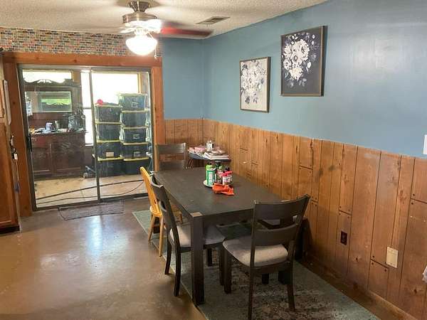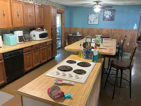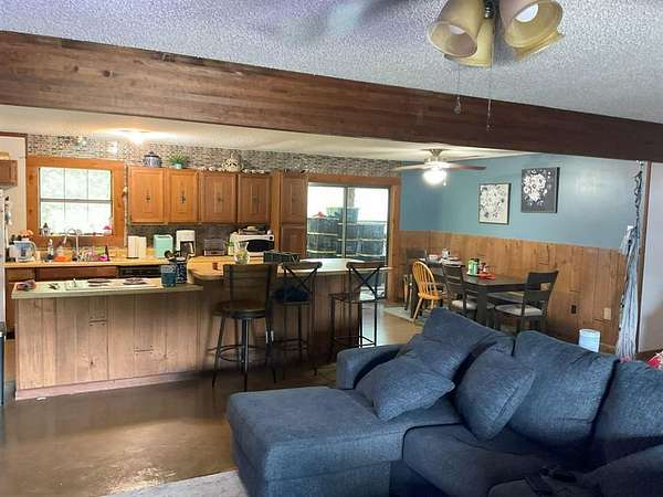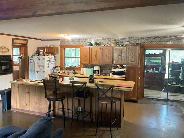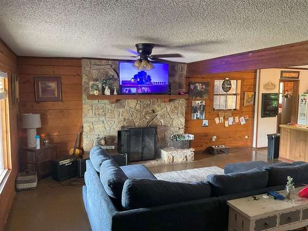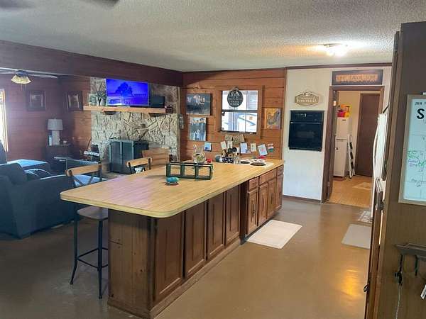 19.68 Acres with a Charming 3-Bedroom home - Peaceful, Private, and Full of Potential. The home sits well off the road, offering peace, privacy, and a large open area in front, perfect for enjoying the quiet country life. Inside, you'll find durable concrete flooring throughout, with vinyl in the utility room and tile in the primary bathroom. The open-concept layout features a spacious kitchen with a large island, complete with a breakfast bar and an electric cooktop. There's ample cabinetry and a generous dining area for hosting family or guests. The living room centers around a striking rock, a wood-burning fireplace, adding warmth and rustic charm. All three bedrooms are comfortably sized and offer plenty of space. Behind the home, the acreage transitions into a mix of open pasture, rolling hills, rocky terrain, and valleys--ideal for grazing cattle, recreational use, or hunting deer and other wildlife. Buyers should verify the Schools and all other information.
