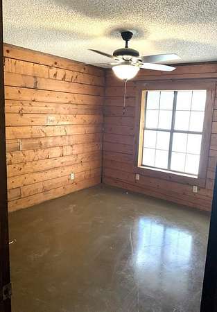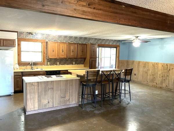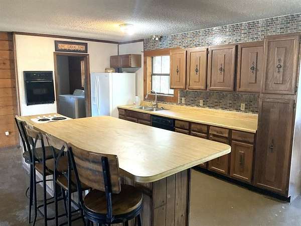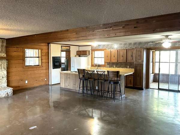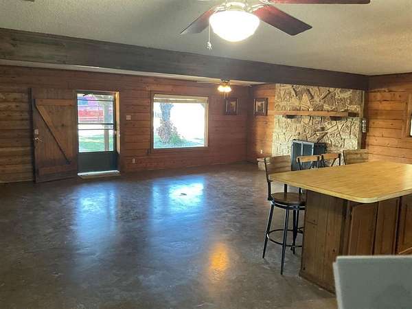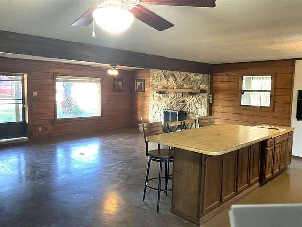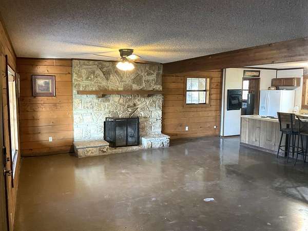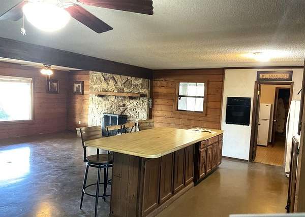 19.68 Acres with a Charming 3-Bedroom home - Peaceful, Private, and Full of Potential. The home sits well off the road, offering peace, privacy, and a large open area in front, perfect for enjoying the quiet country life. Inside, you'll find durable concrete flooring throughout, with vinyl in the utility room and tile in the primary bathroom. The open-concept layout features a spacious kitchen with a large island, complete with a breakfast bar and an electric cooktop. There's ample cabinetry and a generous dining area for hosting family or guests. The living room centers around a striking rock, a wood-burning fireplace, adding warmth and rustic charm. All three bedrooms are comfortably sized and offer plenty of space. Behind the home, the acreage transitions into a mix of open pasture, rolling hills, rocky terrain, and valleys--ideal for grazing cattle, recreational use, or hunting deer and other wildlife. Buyers should verify the Schools and all other information. Washer, Dryer, Refrigerator, and Barstools stay with the property.