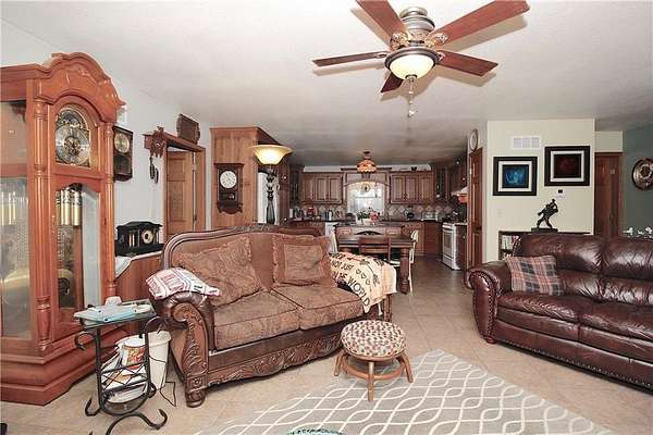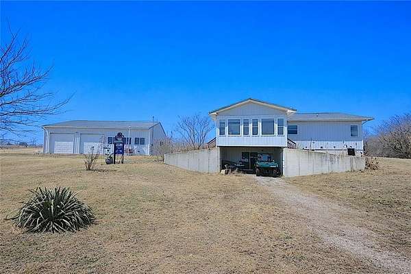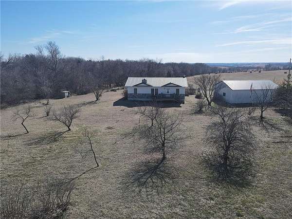 Well cared for, custom Amish built home! Watch wildlife, sunrises & sunsets from your sunroom which overlooks the valley. 2 deer plots so you'll find plenty of deer plus turkey and even quail. Custom kitchen includes cabinets which have rollouts, granite counters, a pantry and an island with wine storage. Solid wood doors throughout. Hardwood floors. Oak bookshelves in office/bedroom. 2 closets in primary bedroom including a walk-in closet. Primary bath has 2 sinks and a huge shower. Walkout basement is ready to be finished however you wish. There is 1 bathroom with a sliding barn door already in the basement plus there are washer/dryer hookups in the basement and also on the main floor in the sunroom. Large stocked pond ready for you to fish in. Fruit trees galore include peach, apple, pear, apricot, plum, sand cherries, chokecherries plus elderberry, black walnut trees, pecan trees and grapevines too! Plenty of beautiful flowers also including irises, day lilies, naked ladies and rose of sharon. Fenced garden area. 30' X 40' 2-car garage/shop has a concrete floor and electric. 28' X 20' outbuilding has a concrete floor, has electric and has a loft. Land consists of hay ground and timber. Located on a blacktop road.