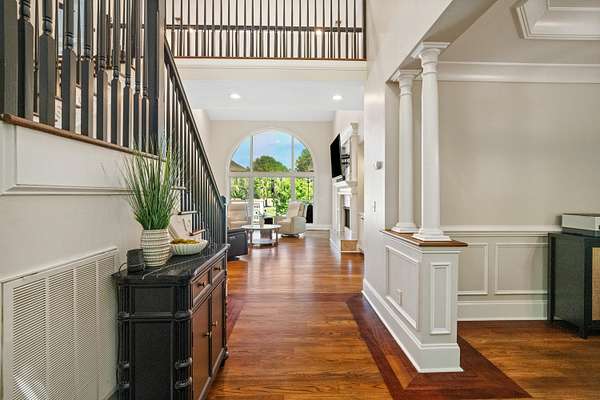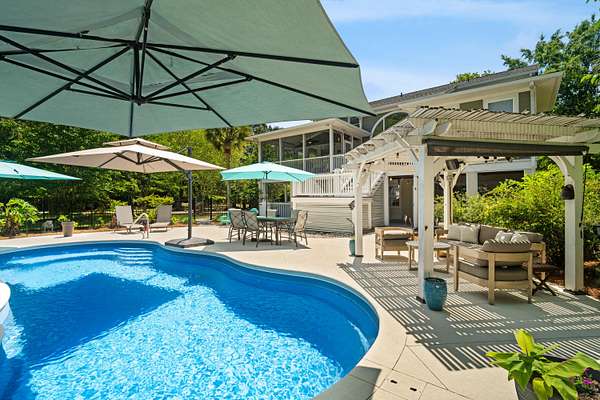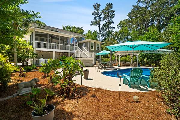 Set on nearly two acres along the 11th tee of Dunes West, this property offers a rare blend of space, golf course views, and a private pool-all within a gated community setting.Surrounded by mature landscaping and natural buffers, the homesite feels quietly tucked away, with a long driveway and access from two roads- providing exceptional parking and flexibility, along with the added convenience of an EV charger.Inside, a dramatic two-story great room creates an immediate sense of openness, anchored by a fireplace with custom built-ins and framed by large picture windows overlooking the pool and golf course beyond. The kitchen is both functional and inviting, featuring two islands-one for cooking and one for casual dining-along with space for both formal and informalgatherings. A separate dining room, currently used as an office, offers versatility as a formal dining space, study, or even a lounge or library. Just off the kitchen, the expansive casual dining area easily transitions into a sitting or sunroom depending on your needs. The primary suite is a true retreat, highlighted by a completely remodeled bath with a beautifully tiled shower, freestanding tub, and a large custom closet, along with direct outdoor access. Upstairs, three additional bedrooms and two baths provide comfortable accommodations, including one with a private en suite. The main level also includes a well-appointed laundry room with additional storage and pantry space, along with a convenient half bath. The lower level offers a thoughtfully designed in-law suite complete with a second kitchen, family room, bedroom, and full bath, all opening to a covered porch. With its own access from the garage and a separate drop zone, this space offers privacy and flexibility--ideal for multi-generational living, extended stays, or guests. Outdoor living is equally compelling, with multiple spaces designed to enjoy the setting--from the upper-level screened porch to the lower-level covered porch, along with a private pool, hot tub, and expansive yard that invites both relaxed everyday living and effortless entertaining. Residents of Dunes West enjoy access to top-tier amenities, including a championship golf course, clubhouse, resort-style pool, tennis courts, new pickleball courts, fitness center, and walking trails. All of this is just a short drive to area beaches, shopping, dining, and approximately 30 minutes to historic downtown Charleston--offering the perfect balance of privacy, space, and convenience.