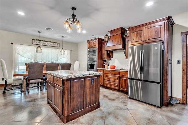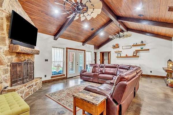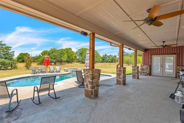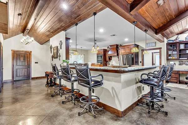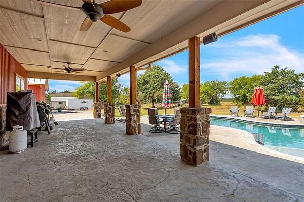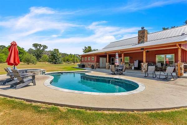 Nestled in the serene countryside of Saltillo, this 3 bedroom, 2.5 bath barndominium on 100 + - acre ranch offers a peaceful retreat with the perfect mix of rural charm and accessibility. Features include a bonus room currently being used as an office, stone-to-ceiling WBFP, surround sound, wood plank ceilings, chiseled edge granite, knotty alder cabinets, farmhouse sink, easy close drawer slides, stained concrete flooring, windmill fans, built-in desk, open eat-in kitchen with island, stainless steel appliances, custom vanities, stone sinks, aged copper claw foot tub, 3 car garage attached to house by a spacious breezeway and so many more custom touches. Enjoy outdoor living under the spacious covered patio ideal for relaxing, entertaining or grilling while overlooking the pool & spa. The 45' x 75' insulated shop with 3 - 14' roll-up doors is perfect for hobbies or storage and features a car lift, full bath, washer & dryer hookups and its own septic. Attached to the shop is a 12' lean-to RV bay with 50 amp electric and sewer hookups. There is also a 12' x 24' shed next to the shop. Utilities are city water, co-op electric, aerobic septic and high-speed fiber internet. The property is ag exempt and is currently used for cattle and hay production. Farm equipment will be available for purchase in a separate transaction. Please see transaction desk for more information. Schedule your showing today and make it yours!