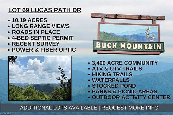 10+ Acres w/BIG VIEWS! Lot is ready for your mtn home! ELECTRIC + FIBER OPTIC already on lot. RECENT SURVEY 10/2/25. CURRENT 4-bedroom septic permit valid through Sept. 2032, driveway in place to prepared bldg site featuring LONG RANGE VIEWS, privacy & seclusion. CREEK on lot near bottom. Looking for a quiet mtn place to build a weekend getaway? Conveniently located in 3,400 acre Buck Mtn, ONLY GATED ATV COMMUNITY in Wilkes County. Long & short-term rentals allowed. PRIME LOCATION! Only 1 hr from Winston & 1 hr 40 min from Charlotte. Just minutes from High Country activities. Centrally located 35 min from Boone, West Jefferson & Wilkesboro. Near BLUE RIDGE PKWY, ASU, shopping, dining, golf, wineries, breweries, mtn biking & skiing. BUCK MTN AMENITIES: ATV & Hiking Trails, Parks, Fishing Pond, Water Falls, Pavilions, Community Center, Helipad, Outdoor Activity Center w/amphitheater for live music. 1,400 SF min to build. NO TINY HOMES. NO MOBILE HOMES. NO CAMPING. NO SELLER FINANCING.