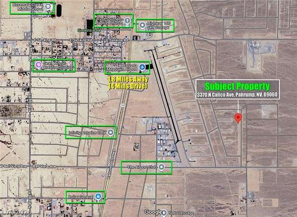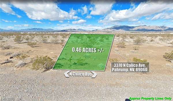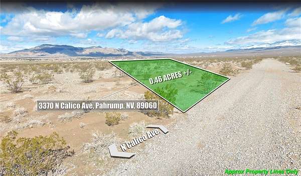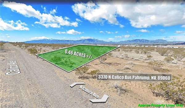 Owner Willing to Carry the Note. Looking for development land in Pahrump with long-term potential? This 0.46-acre lot, located adjacent to Calvada Meadows Airport, offers Mountain View’s and future development possibilities. Situated off N Calico Ave on a gravel road, the parcel provides convenient access while maintaining the open desert setting buyers seek in rural Nevada. The area is ideal for outdoor enthusiasts, with nearby ATV trails and wide-open desert landscapes. Pahrump is a rapidly growing community and a gateway to outdoor destinations such as Death Valley National Park and Ash Meadows National Wildlife Refuge. The property is also within reach of local attractions include Spring Mountain Motor Sports Ranch, Mountain Falls Golf Course, renowned wineries, casinos, and various dining options. Don't miss the chance to explore this promising lot and all that Pahrump has to offer!