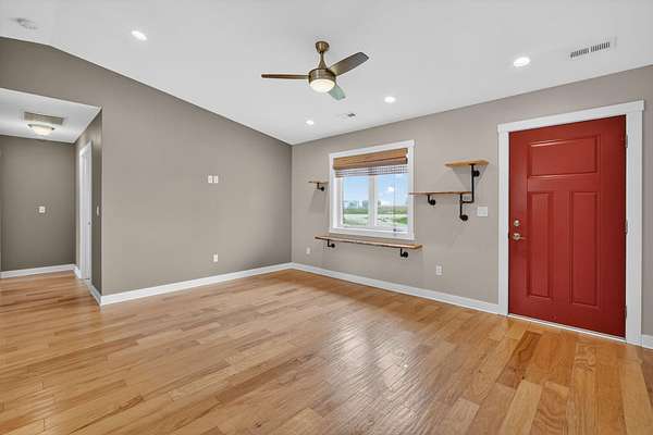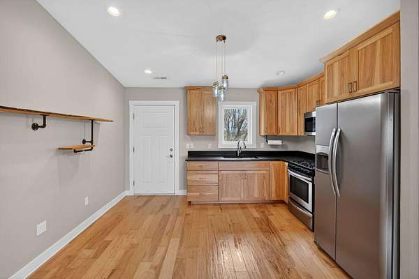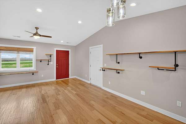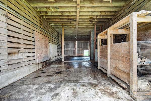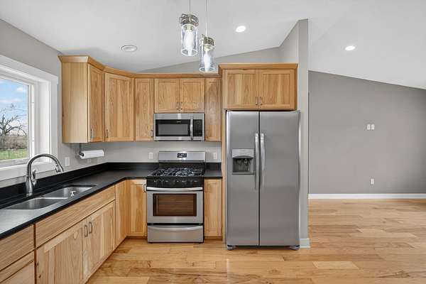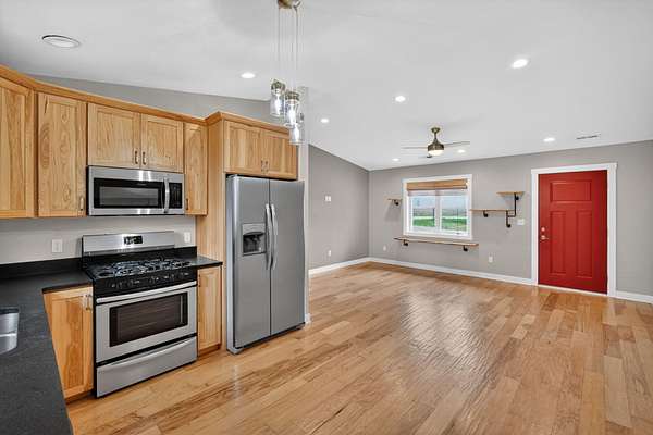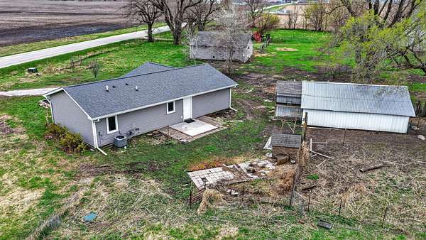 Modern ranch-style home built in 2017 on 3.49 acres just south of Ellsworth offers easy living with no steps and everything on one floor. This 2 bed, 1 bath home features an open floor plan with comfortable living and kitchen spaces, natural wood cabinetry, stainless steel appliances, a gas stove, and an attached garage. The bathroom includes tiled floors, a walk-in shower, and stack washer/dryer. Outside you'll find a koi pond and rear patio space, along with a rustic barn, chicken coop, and an outbuilding with stalls. The outdoor space offers the freedom to make it your own, whether you're looking for space for chickens, goats, horses, gardening, or simply room to enjoy the outdoors. Paved road access and easy access to I-35 make commuting convenient.