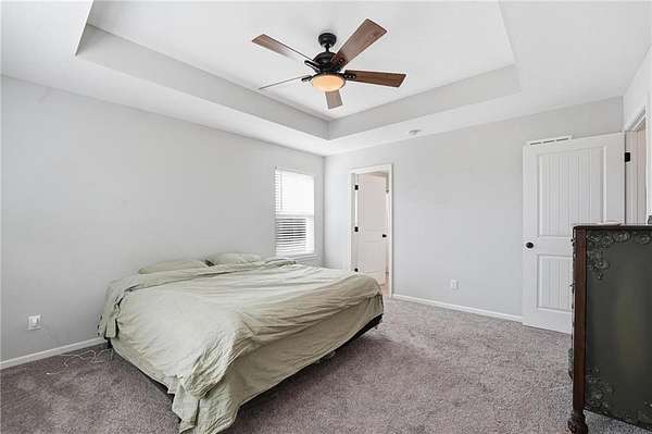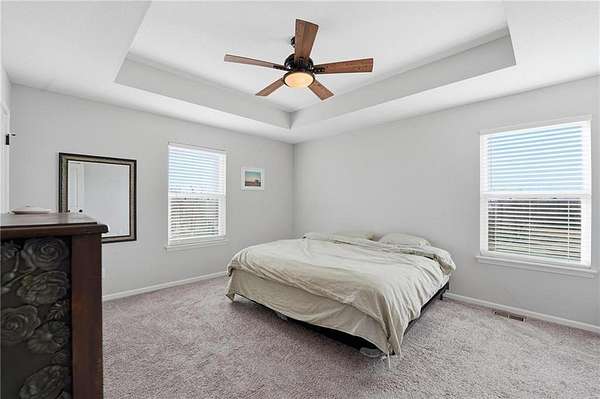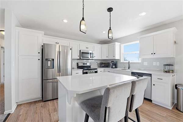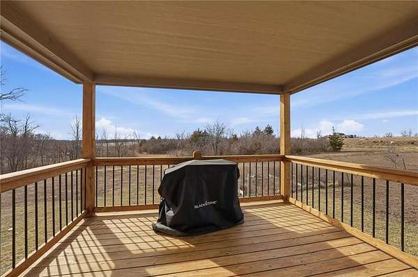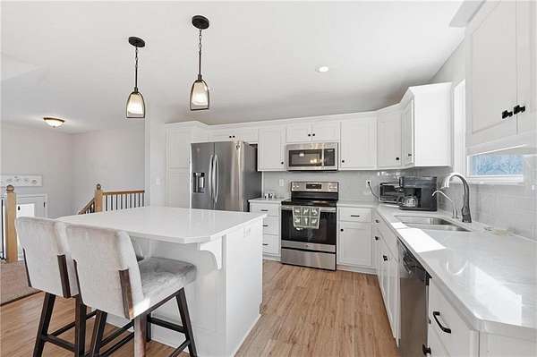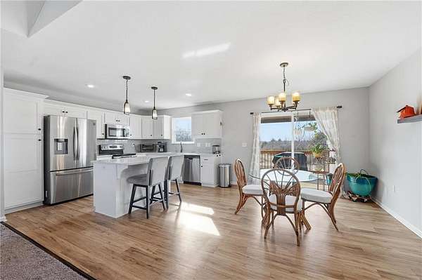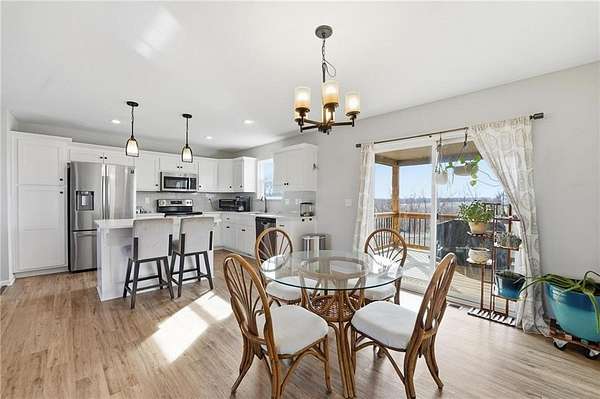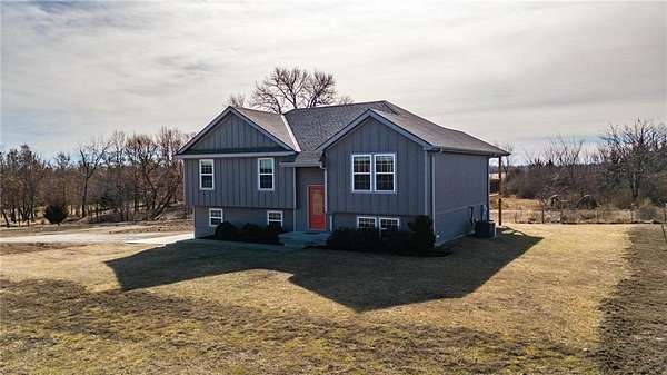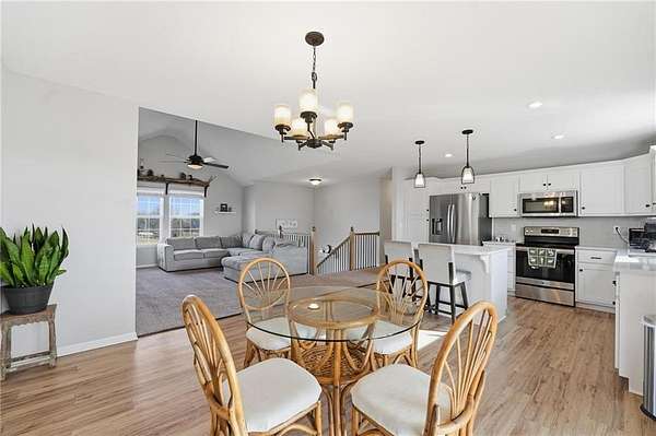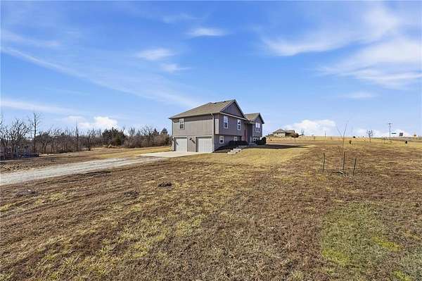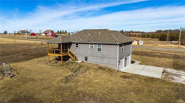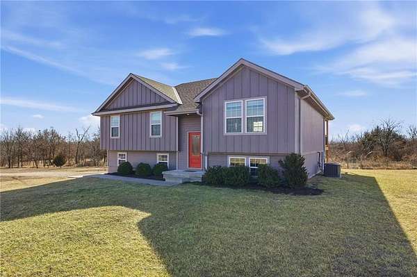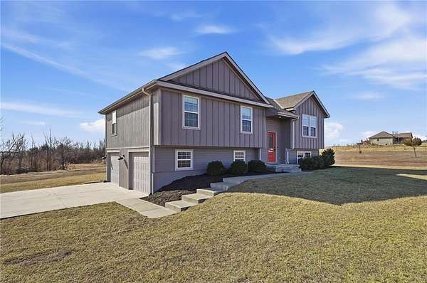 New to market on 3.27+/- acres-enjoy newer construction with wide-open views and room to roam. This split-entry home features an open main-level layout with vaulted ceilings, a spacious living area, and a bright kitchen highlighted by white cabinetry, stainless appliances, and a large island-perfect for everyday life and entertaining. The dining area walks out to a covered deck, ideal for morning coffee and sunset views. The main level offers 3 bedrooms and 2 full baths, including a private primary suite. The finished lower level adds a large rec/flex space plus a half bath and laundry-great for a second living room, home gym, or game room. A built-in 2-car garage and extended driveway provide plenty of parking. If you've been waiting for acreage with modern finishes and a functional floor plan, this is the one.